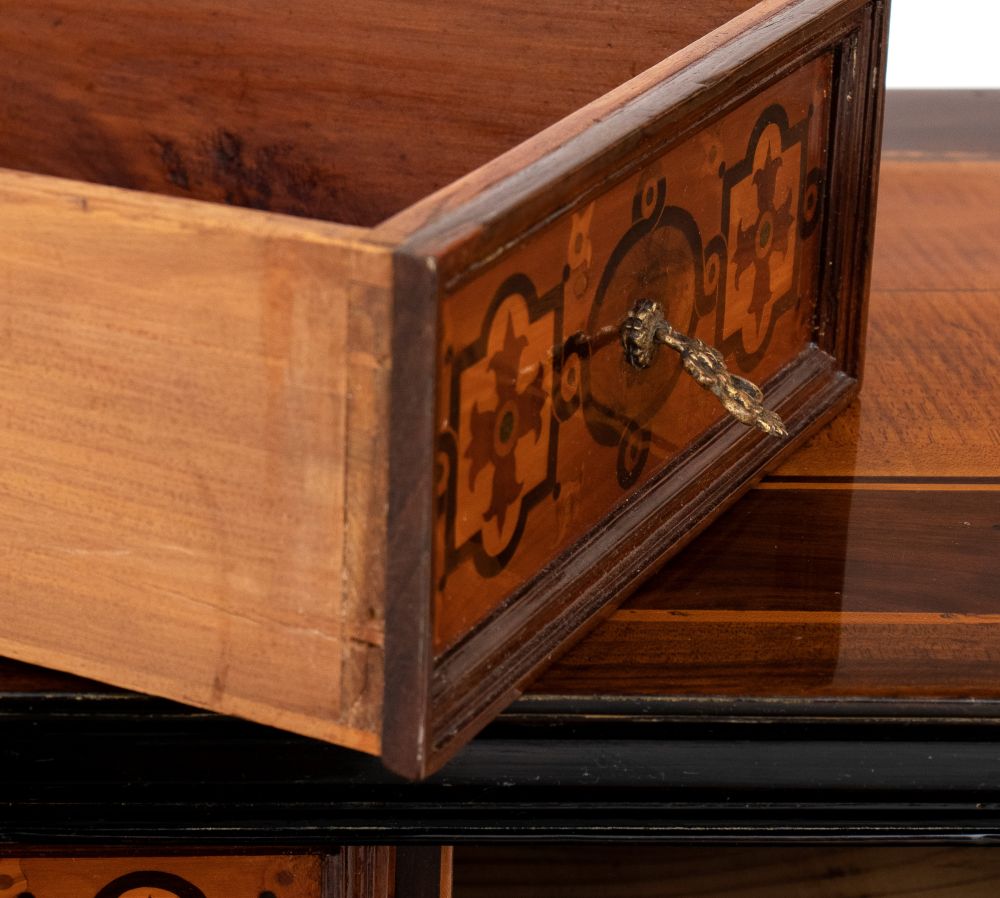 di forma rettangolare, poggiante su un solido zoccolo modanato. Presenta una struttura in noce e un'impiallacciatura in Palissandro (Dalbergia spp.), arricchita da una complessa tarsia geometrica e floreale che impiega legni chiari come l'Acero e rossastri come il Bois de Rose e Radica. Il fronte è delineato da una ribalta, la cui superficie esterna è finemente intarsiata con un motivo a volute e intrecci geometrici che circondano un grande ovale centrale in radica. L'interno si articola due file verticali di quattro cassetti l'una, di cui i due in basso di dimensioni maggiori; al centro si apre uno scomparto sormontato da un ulteriore cassetto. Ogni cassetto è decorato con la medesima tarsia simmetrica ed è dotato di un pomello a decorativo. Il vano centrale, invece, presenta una tarsia figurativa on una minuziosa scena prospettica o architettonica, protetta da una serratura centrale, la cui funzione è quella di celare il vano più interno e segreto del monetiere.