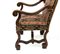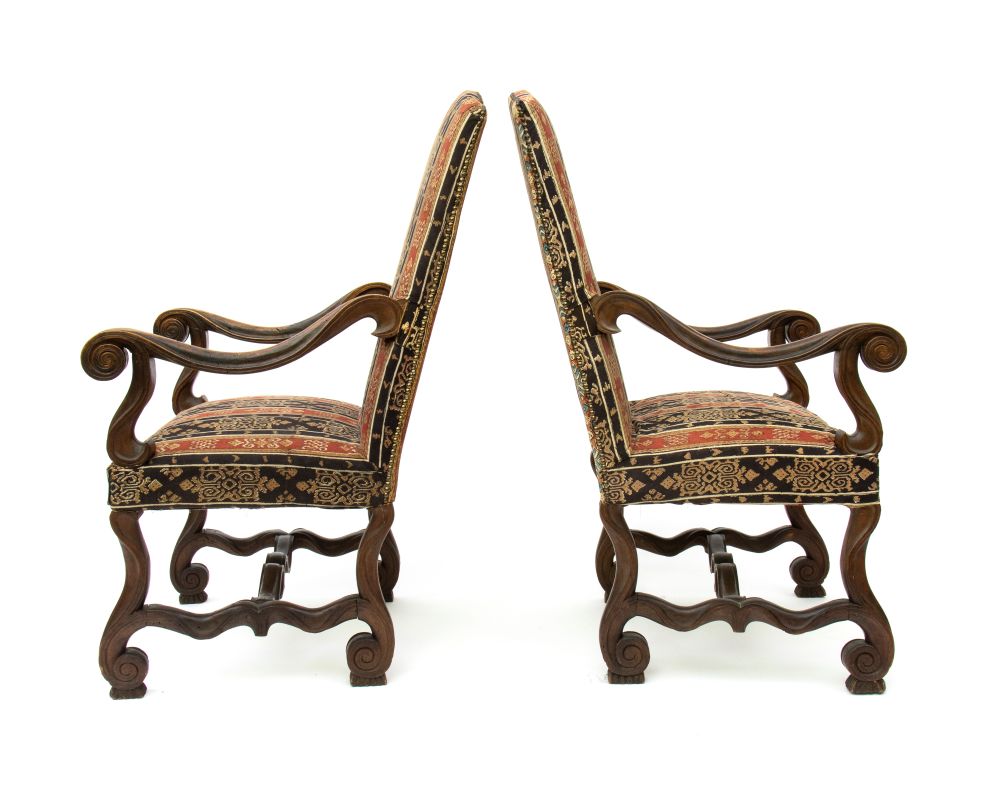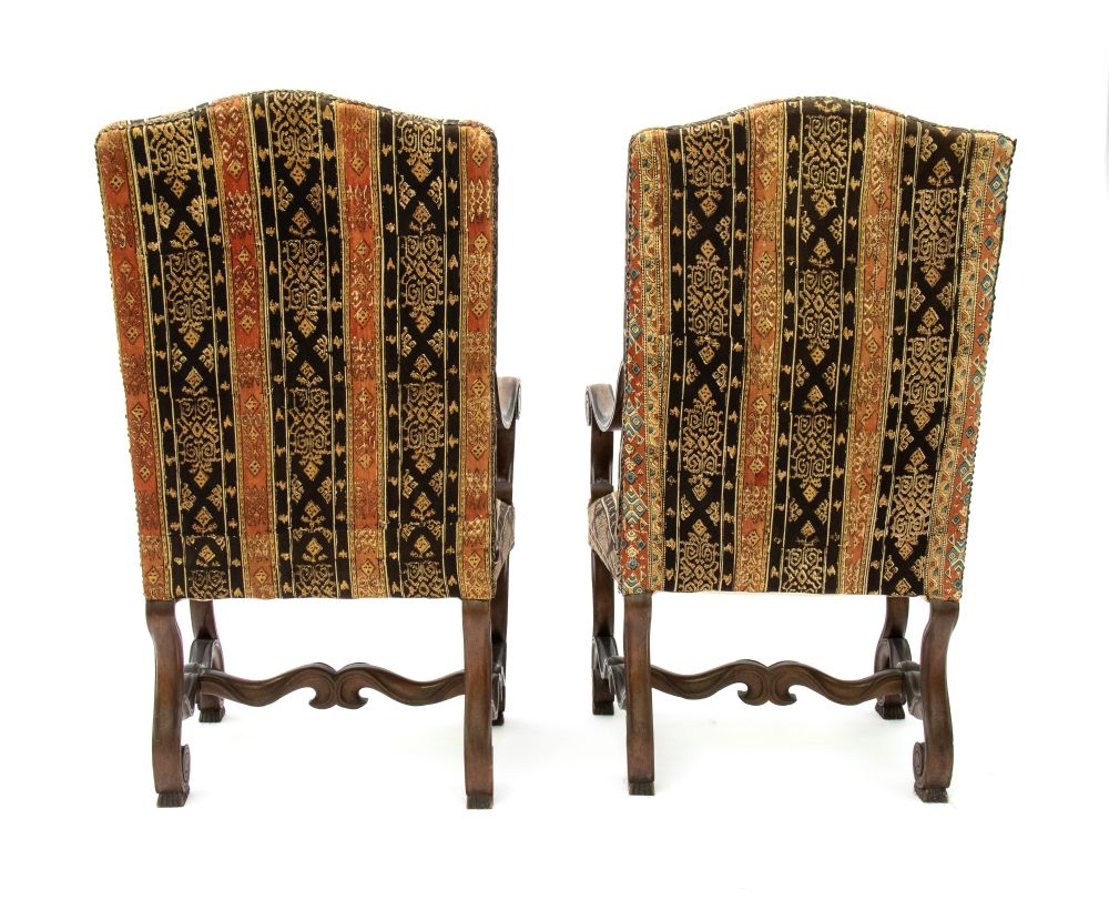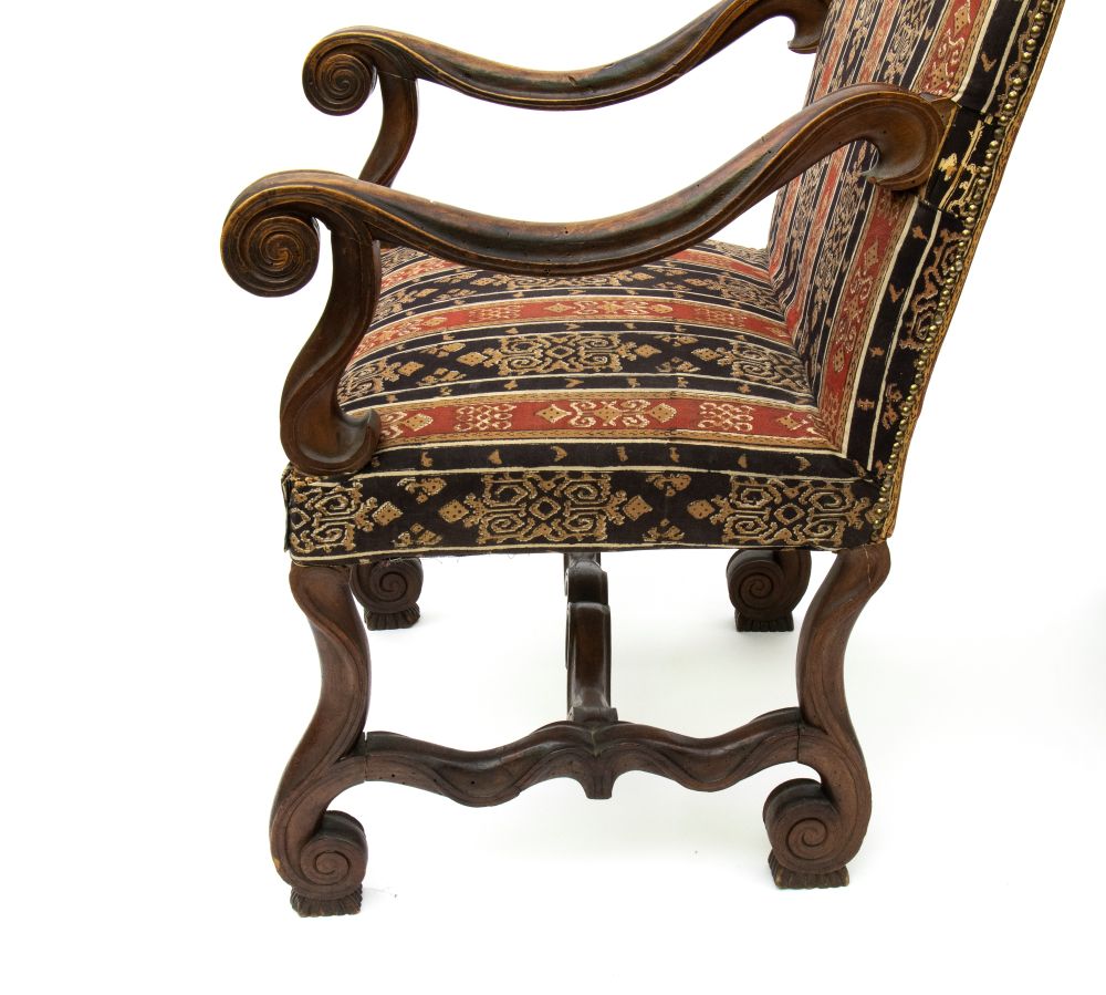 scolpite, con gambe mosse raccordate da traverse a "H" sagomate e intagliate, braccioli mossi con ricciolo terminale e piedi anteriori a voluta. Schienale e seduta imbottiti e rivestiti con tessuto a motivi geometrici e vegetali con toni del rosso, dell'oro e del nero.