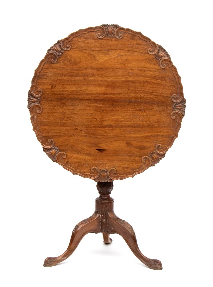 in legno di mogano, con piano ribaltabile rotondo finemente intagliato lungo il bordo con motivi a volute e conchiglie. Basamento tripode con gambe arcuate e piedini ricurvi, intagliati con decori fogliacei. Meccanismo originale con cerniera e blocco in ottone.