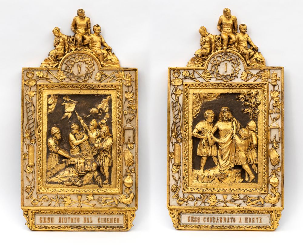 in legno intagliato, dorato e dipinto a tempera raffiguranti stazioni della Via Crucis: I stazione:" Gesù condannato a morte". V stazione:" Gesù aiutato dal Cireneo". Ogni formella è finemente scolpita a rilievo, sormontate da gruppi scultorei di putti seduti, numerazione romana incisa nella parte alta. Fine del XVIII secolo