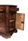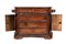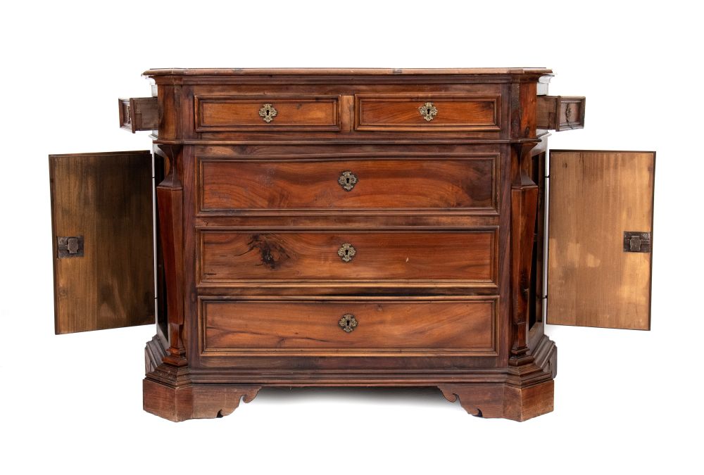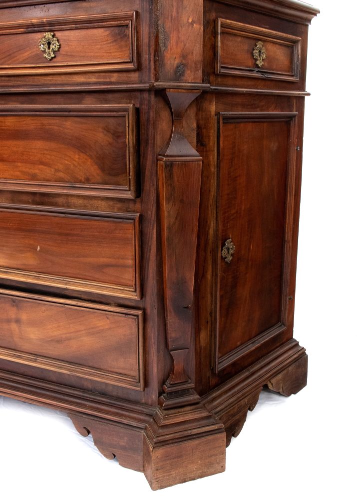 in legno di noce, fronte a tre cassetti più due piccoli cassetti nella parte superiore, lateralmente troviamo due sportelli con all'interno ripiani e sopra di essi due piccoli cassetti. Sulle lesene vi sono poste due colonne a rilievo e la base poggia su piedi a mensola. 1930 ca.