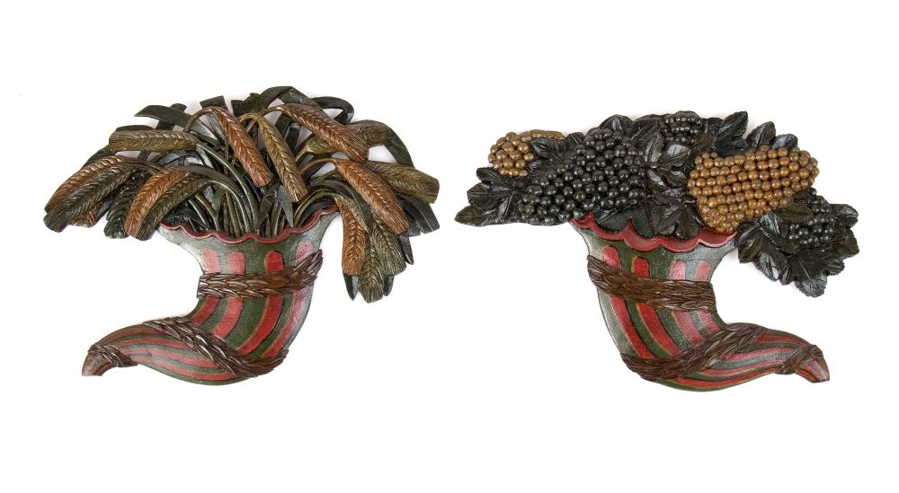 Coppia di fregi italiani a forma di cornucopia, Luigi XVI Italia centrale, XVIII secolo Altezza x larghezza x profondità: 42 x 55 x 3 cm.