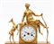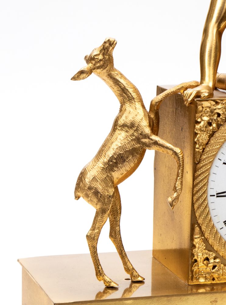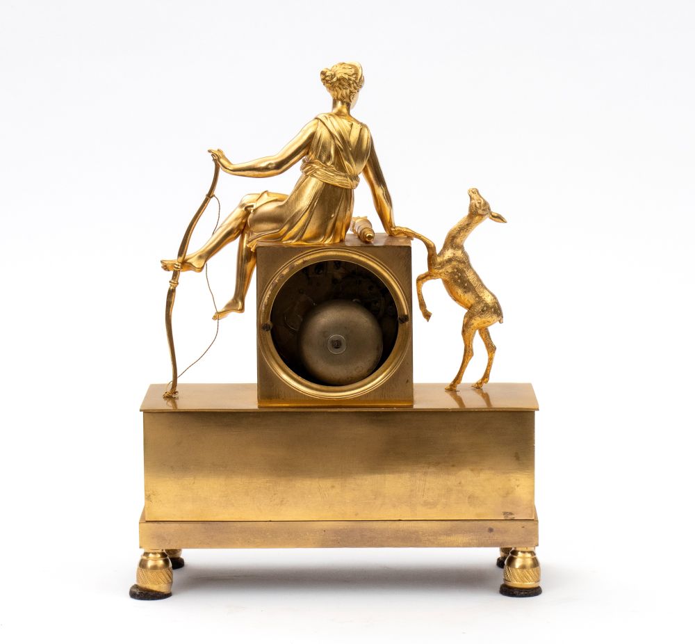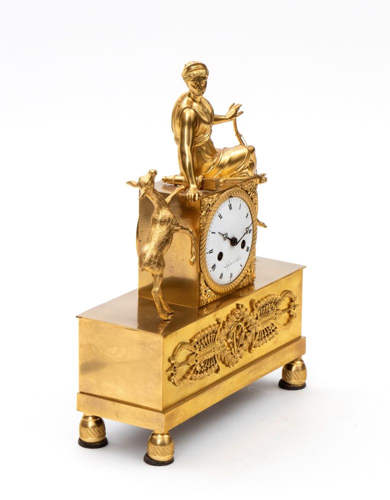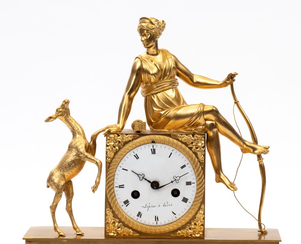 con cassa finemente cesellata raffigurante Diana cacciatrice seduta con arco, accompagnata da un cerbiatto. Base rettangolare decorata a motivi classici con tralci d'alloro e mascherone centrale. Quadrante circolare smaltato con numeri romani e firmato "Lepin à Paris", con movimento meccanico a sospensione a filo.