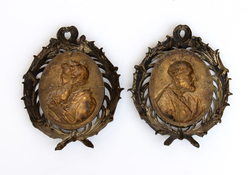 Coppia di placchette in bronzo raffiguranti San Pietro e Paolo Italia, XIX secolo Altezza x diametro: 20,5 x 17,5 cm. Peso: 720 gr.