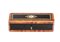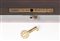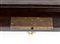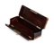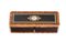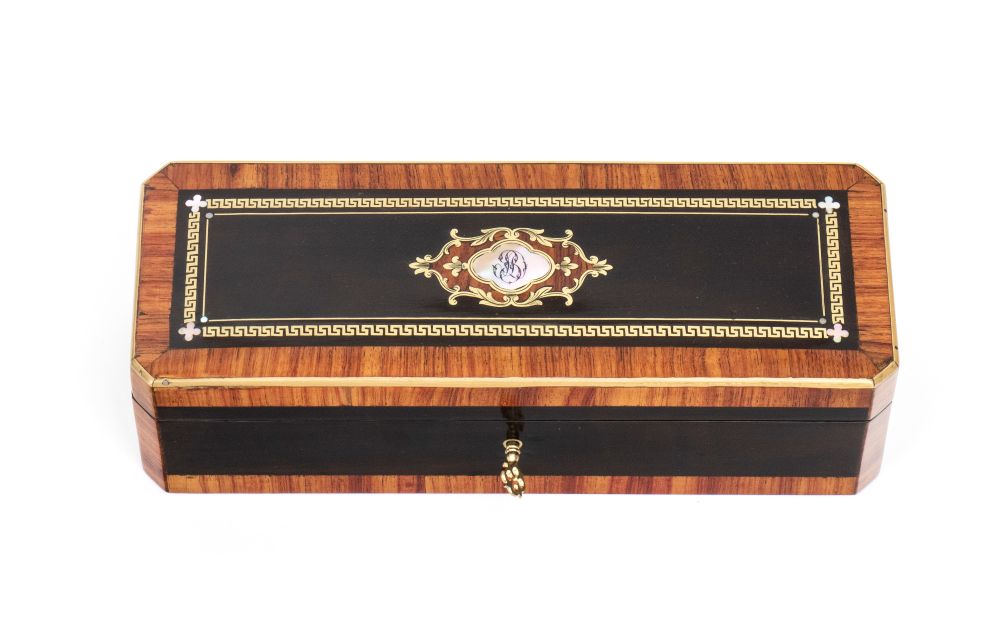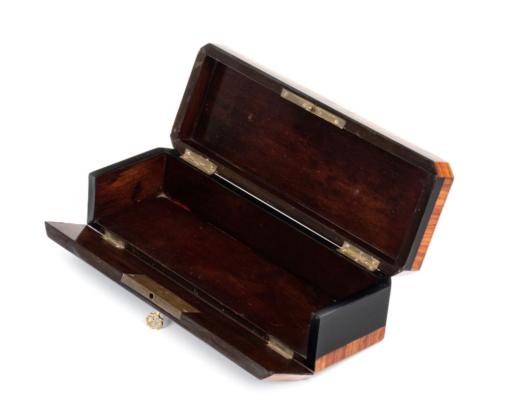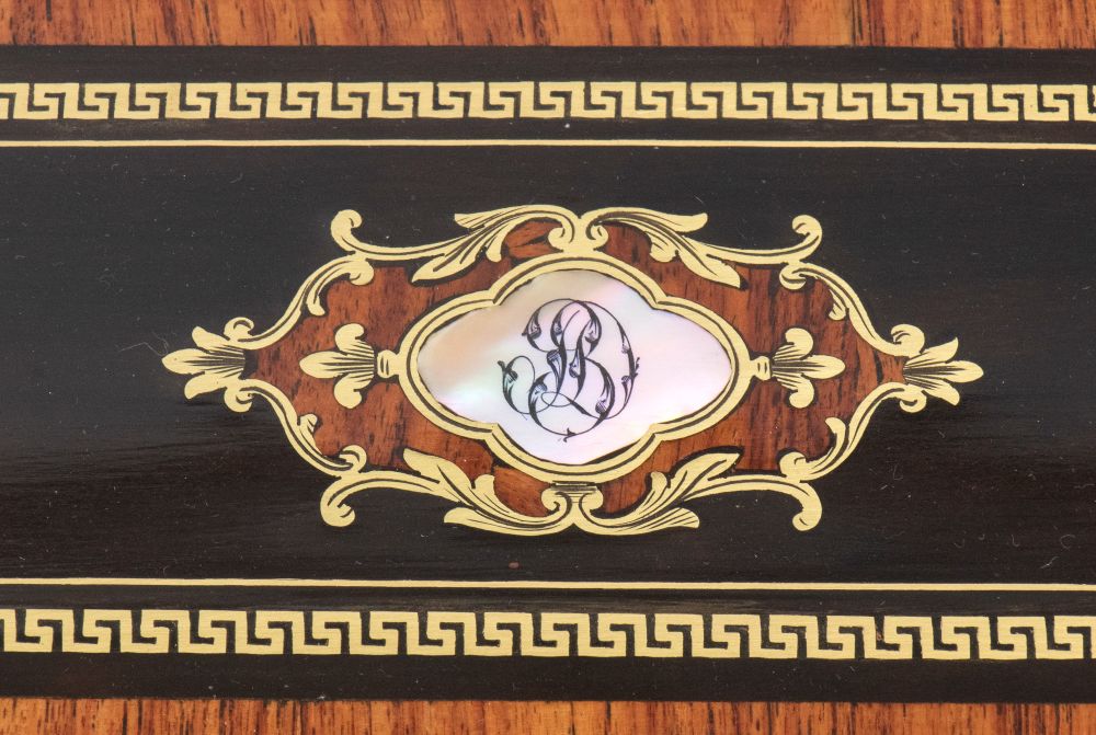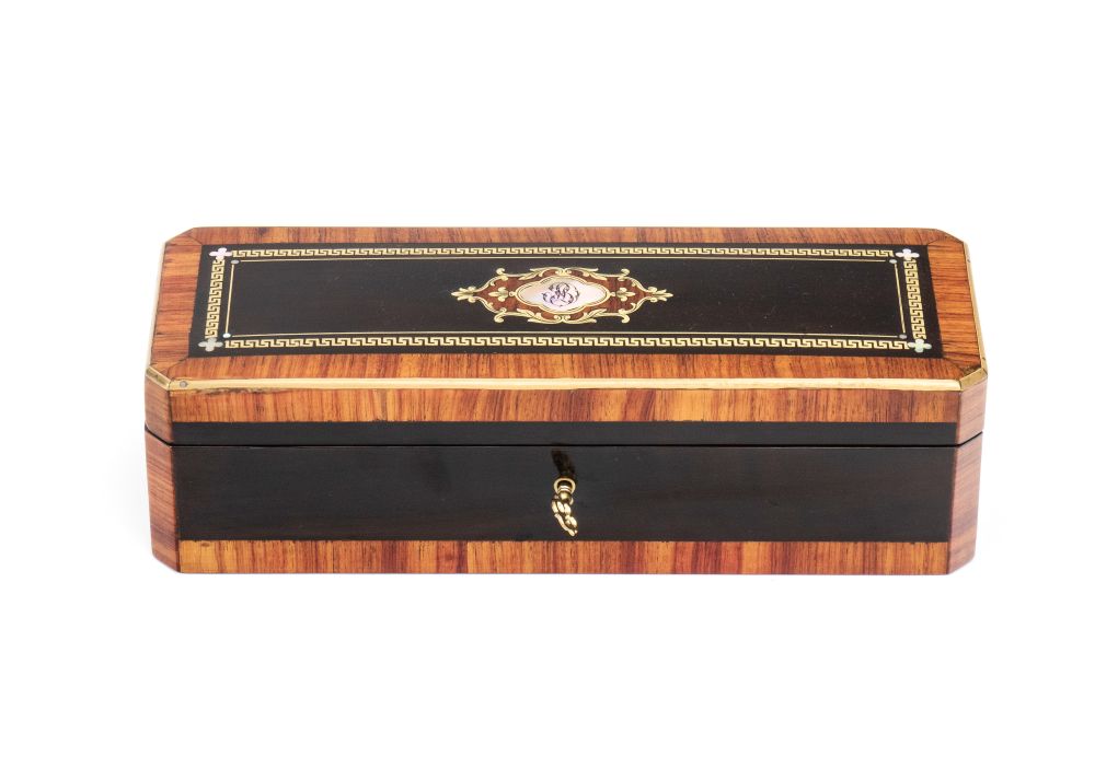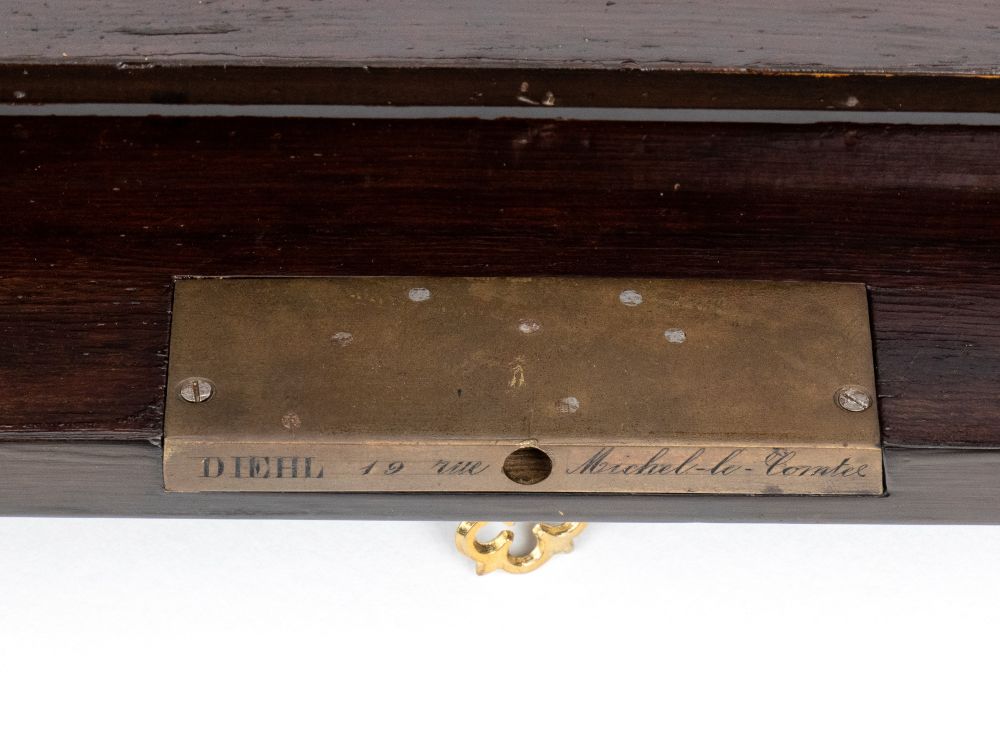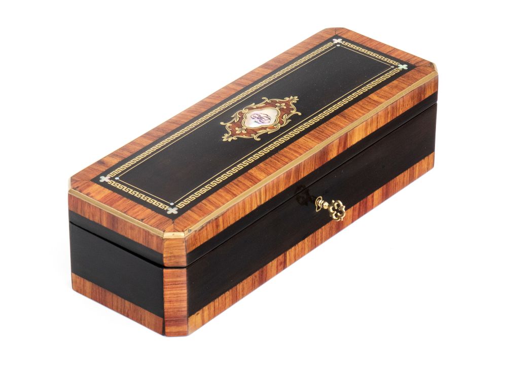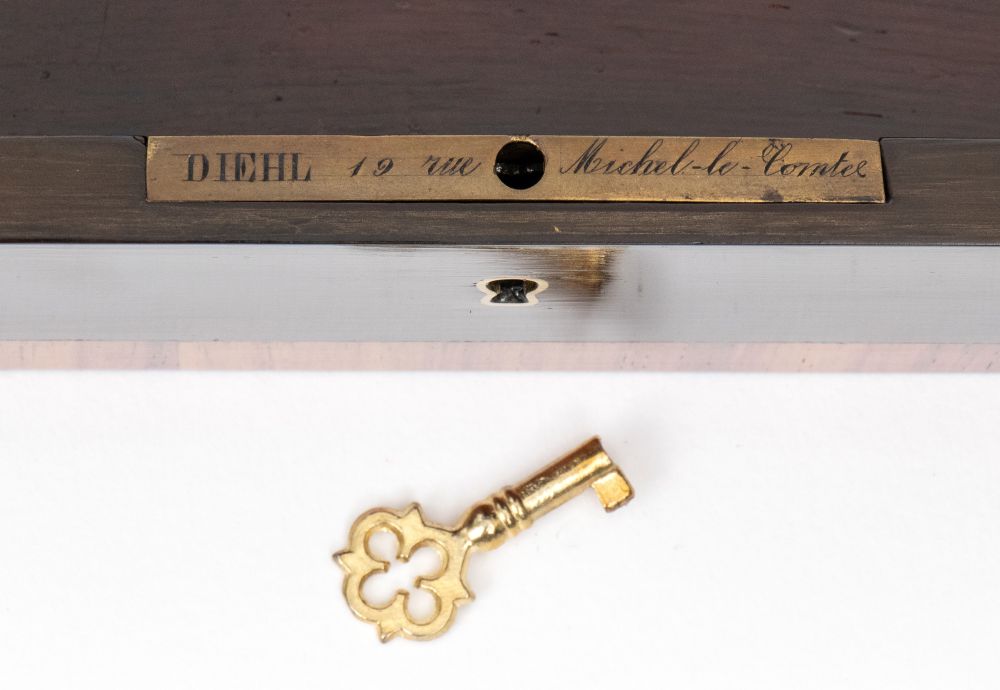 di forma rettangolare in legno intarsiato e radicato, con decorazioni in ottone e madreperla. Firmata sulla serratura "Diehl". Il coperchio, profilato in ebano viola (Dalbergia cearensis, Ducke, 1925), presenta una riserva centrale ebanizzata, con cornice a greca in ottone e un medaglione ovale in madreperla, inciso con monogramma entro una montatura in ottone dorato finemente cesellato. Serratura frontale con bocchetta in bronzo dorato.