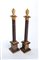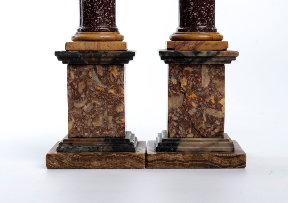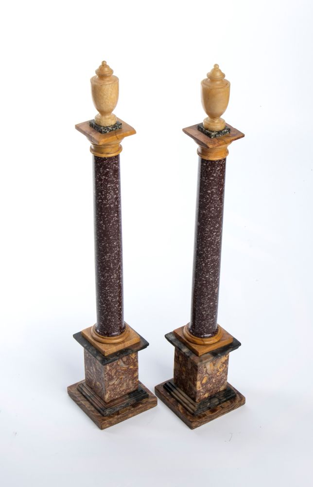 raffinata coppia di colonne in marmo policromo, composte da base in breccia medicea, fusto in marmo rosso, capitello e cornici in marmo giallo Siena. La parte superiore è sormontata da eleganti urne in alabastro.