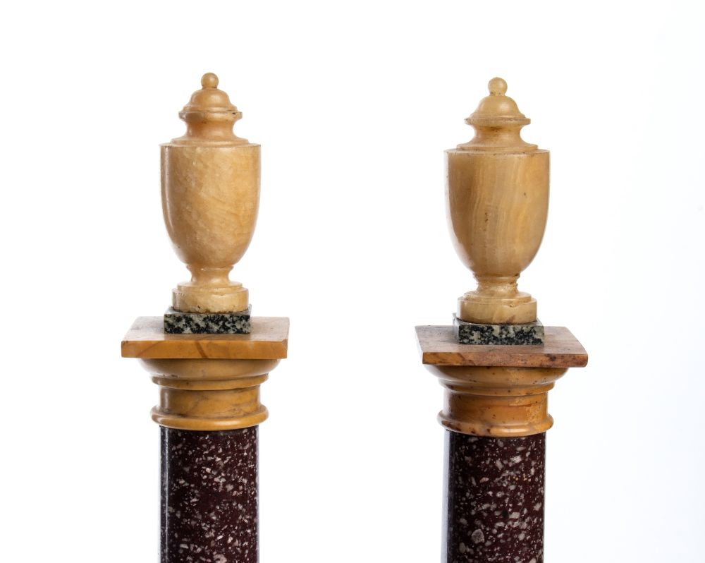 Coppia di colonne in marmo con urne Italia, XVIII secolo Altezza x larghezza x profondità: 37,5 x 7 x 7 cm.