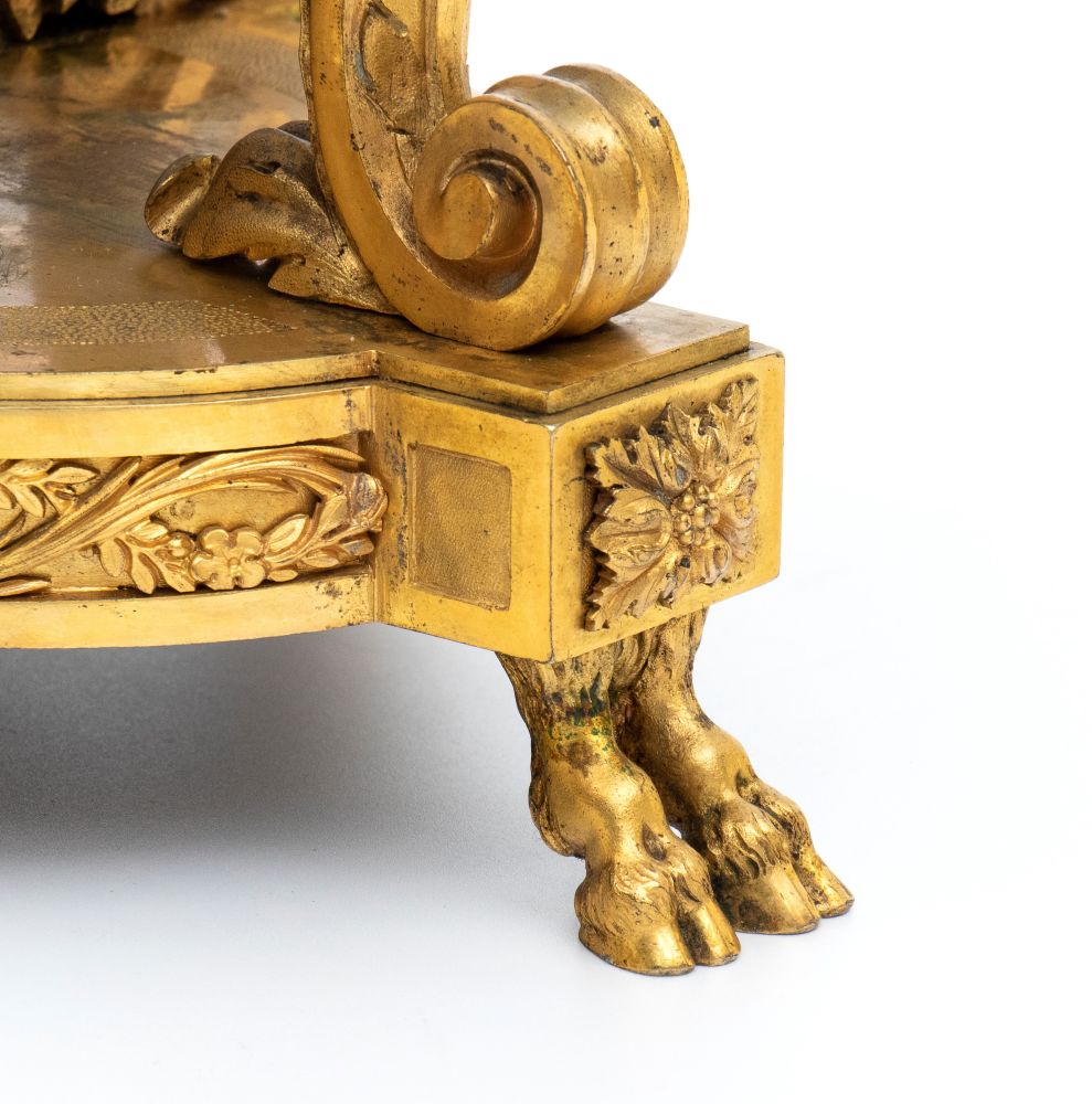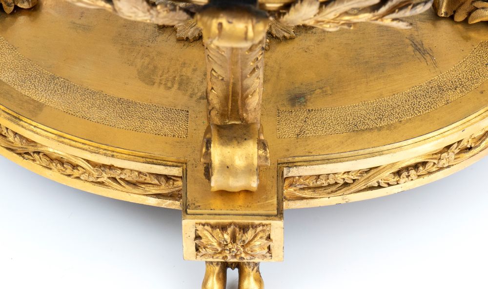 Ad importante corredo dell'opera troviamo un'imponente quanto elegantissima montatura in bronzo dorato (al mercurio, ovviamente) di grande finezza e fattezze esecutive, con mascheroni sulle prese laterali a ondulati racemi e sostegno di base a quattro grandi volute a C su piattaforma ovaloide con protuberanze poliedriche e piedi ferini a doppio zoccolo.