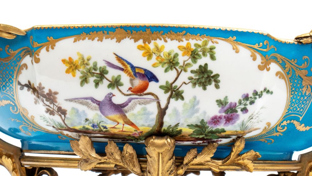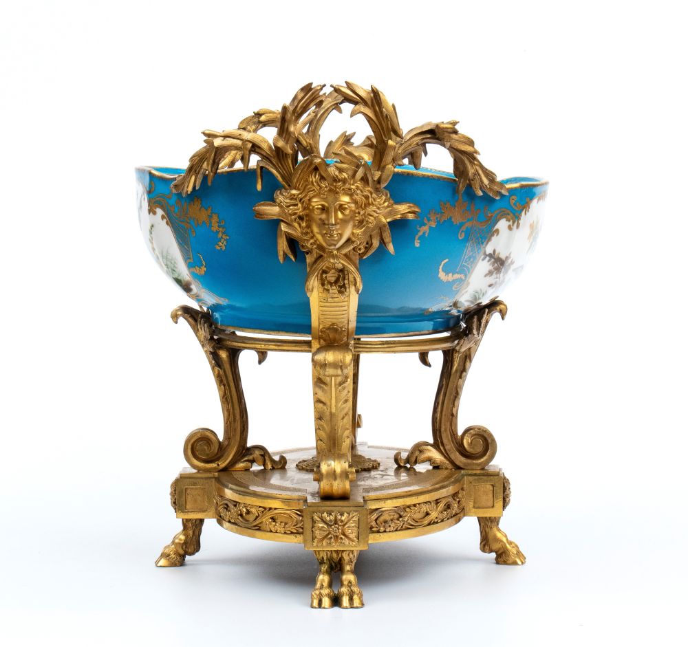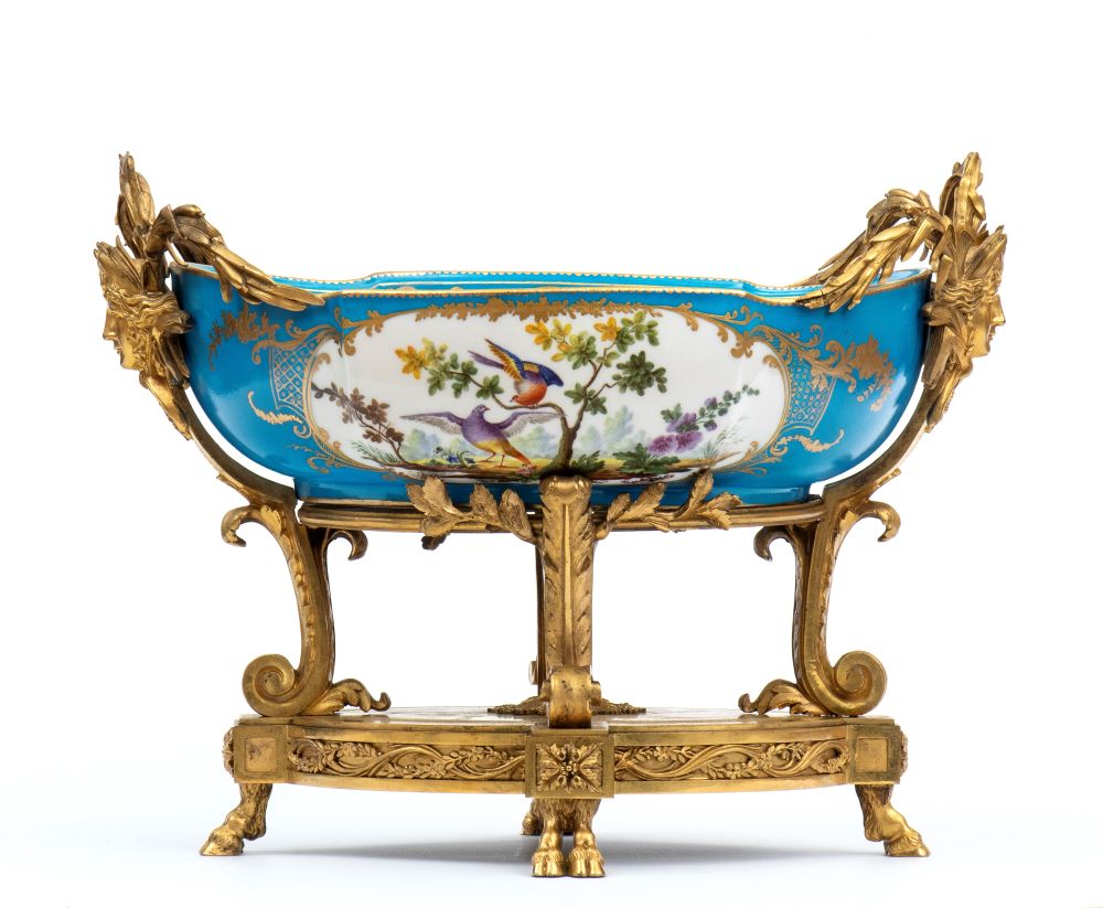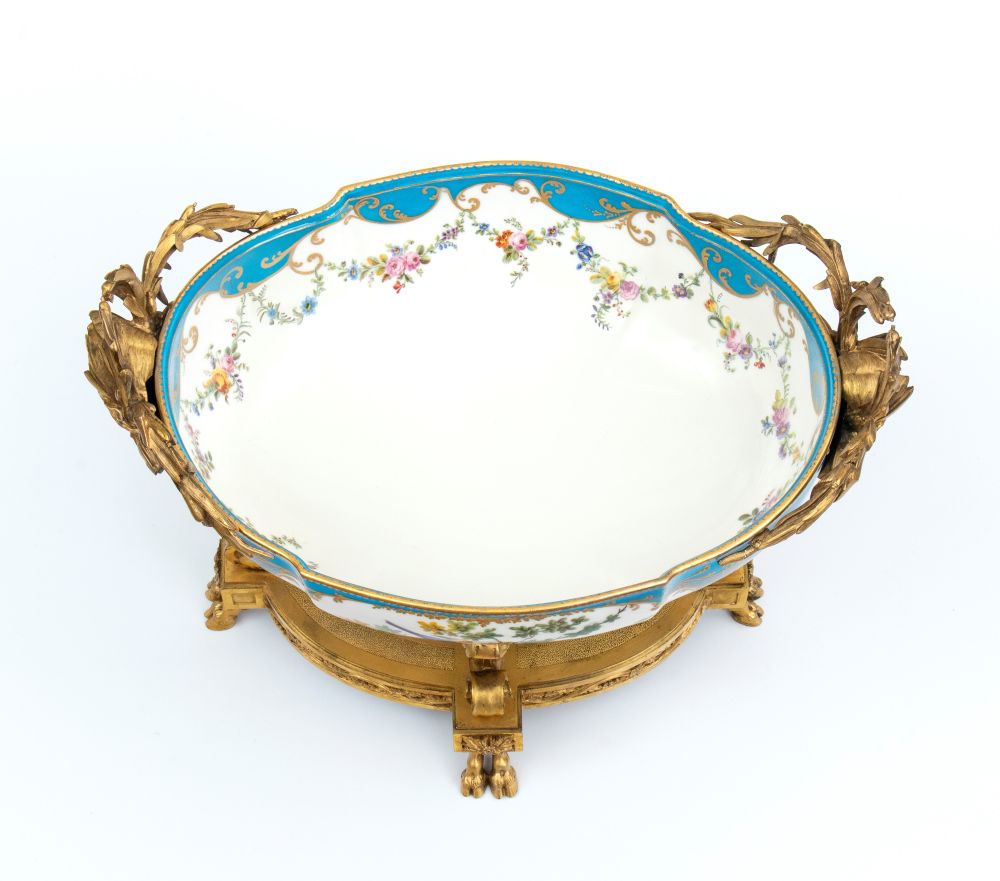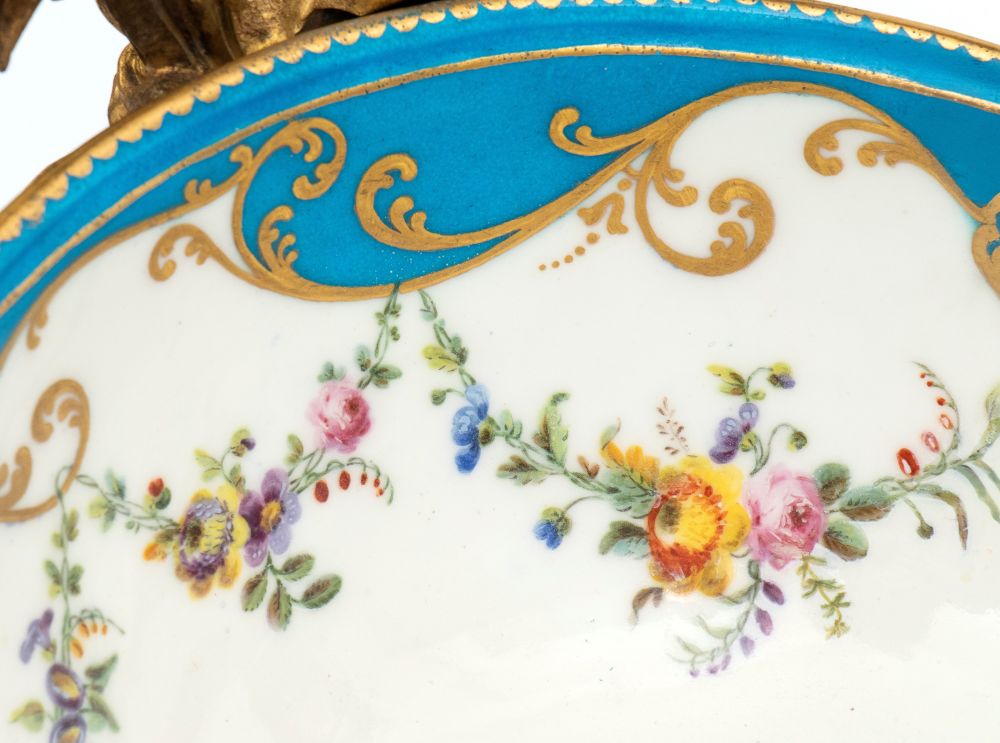 in porcellana policroma in bleu celeste e riserve bianche - con splendido decoro floreale a ghirlande intrecciate all'interno della grande coppa e ampia riserva sul corpo frontale con rametti ed uccelli, contornati da bellissimi racemi dorati - appartiene sicuramente alla raffinatissima produzione della Manifattura delle Porcellane di Sèvres dove fu dipinta nel 1764 (lettera dataria L all'interno delle due L incrociate) da Nicolas Catrice, ivi pittore dal 1757 al 1774 e specializzato in tali espressioni decorative (mazzolini di fiori, ghirlande, e relativi complementi). Troviamo infatti in alto sul marchio di decorazione da egli stesso apposto e dipinto in blu (le due L incrociate e la lettera dataria all'interno) il suo monogramma, una sorta di croce uncinata o se vogliamo, due lettere S intersecanti e addossate, sempre dipinte in blu. I marchi, originali, confermano quanto già era emerso dalla visione del corpo ceramico (bianco tipico di Sèvres, bleu celeste autentico, decori policromi e dorature).