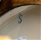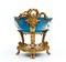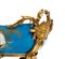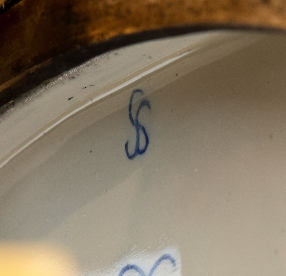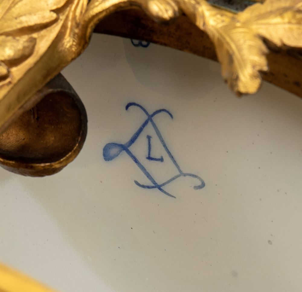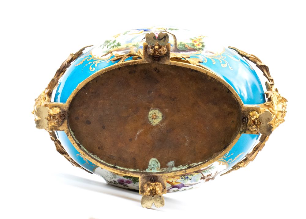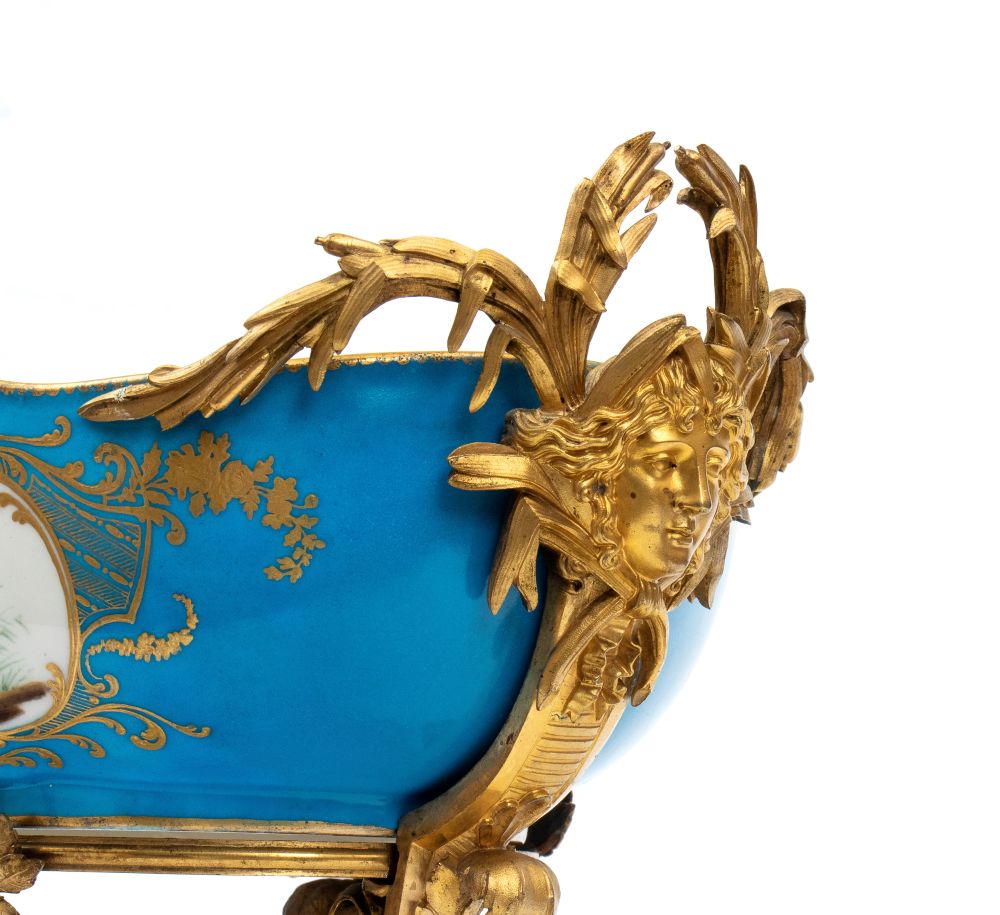 in porcellana policroma in bleu celeste e riserve bianche - con splendido decoro floreale a ghirlande intrecciate all'interno della grande coppa e ampia riserva sul corpo frontale con rametti ed uccelli, contornati da bellissimi racemi dorati - appartiene sicuramente alla raffinatissima produzione della Manifattura delle Porcellane di Sèvres dove fu dipinta nel 1764 (lettera dataria L all'interno delle due L incrociate) da Nicolas Catrice, ivi pittore dal 1757 al 1774 e specializzato in tali espressioni decorative (mazzolini di fiori, ghirlande, e relativi complementi). Troviamo infatti in alto sul marchio di decorazione da egli stesso apposto e dipinto in blu (le due L incrociate e la lettera dataria all'interno) il suo monogramma, una sorta di croce uncinata o se vogliamo, due lettere S intersecanti e addossate, sempre dipinte in blu. I marchi, originali, confermano quanto già era emerso dalla visione del corpo ceramico (bianco tipico di Sèvres, bleu celeste autentico, decori policromi e dorature).