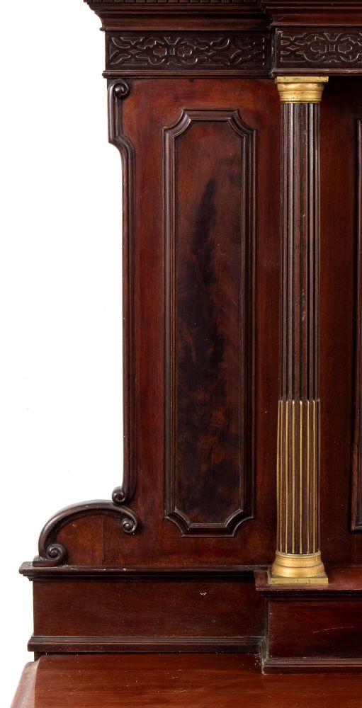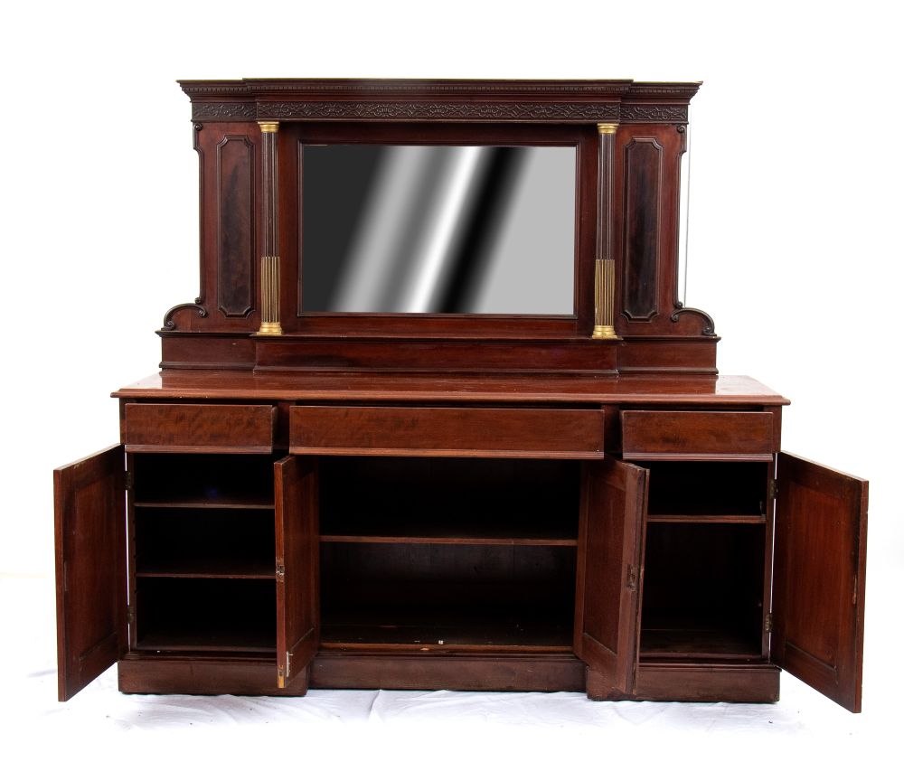 in legno di mogano e piuma di mogano con quattro sportelli e tre cassetti: alzata decorata a traforo cieco con specchio centrale e due colonne con parti in bronzo dorato