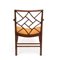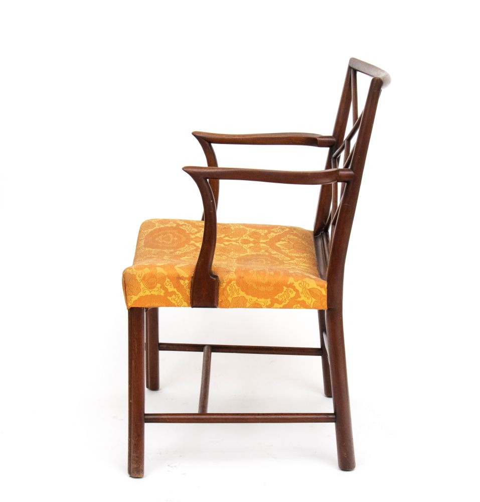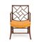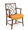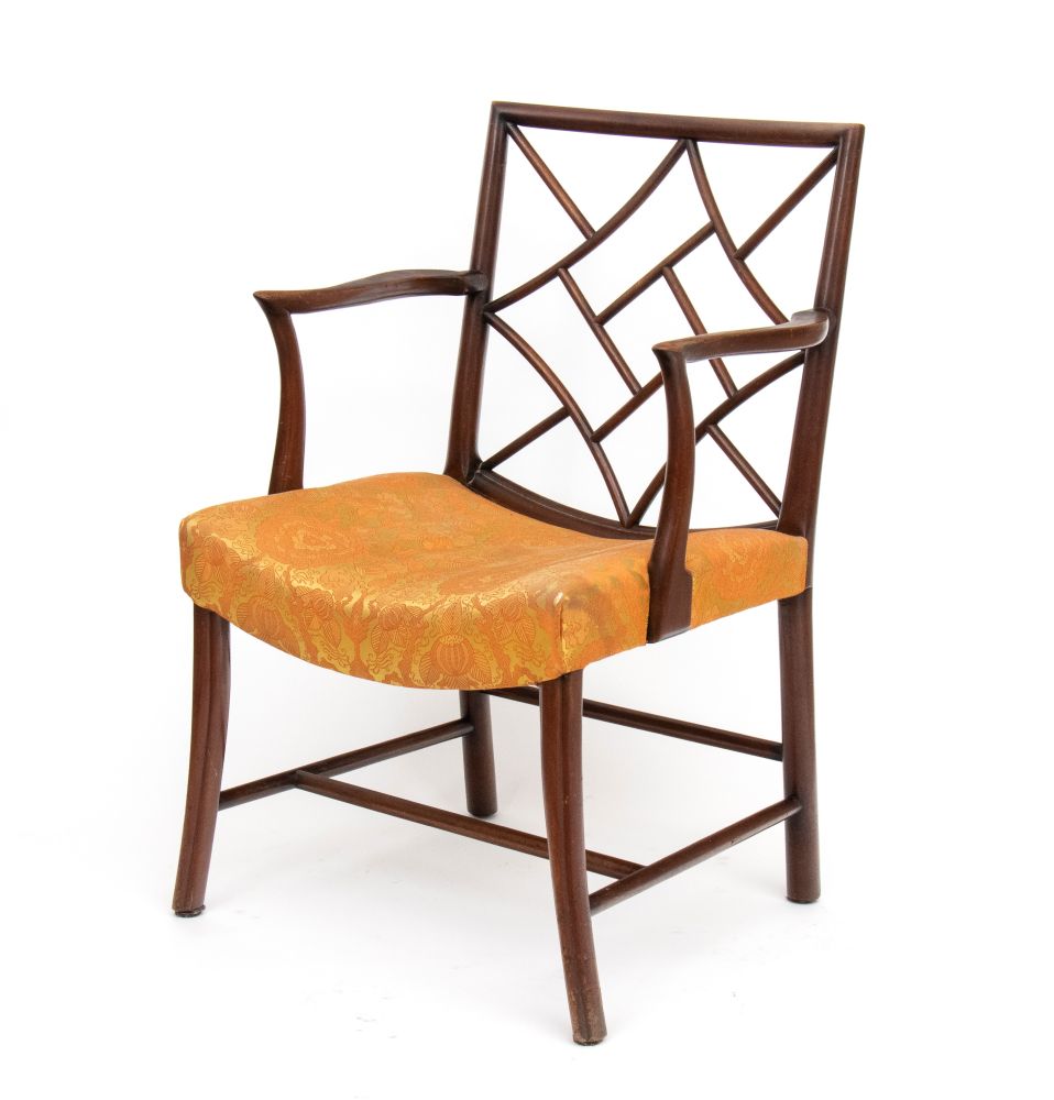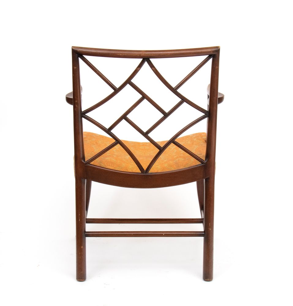 in mogano, con schienale geometrico a traforo incrociato di gusto cinese, seduta incurvata imbottita. Braccioli mossi e gambe arcuate, con traverse di rinforzo inferiori.