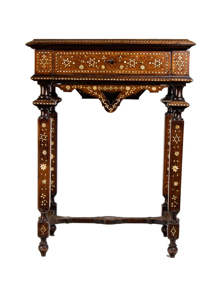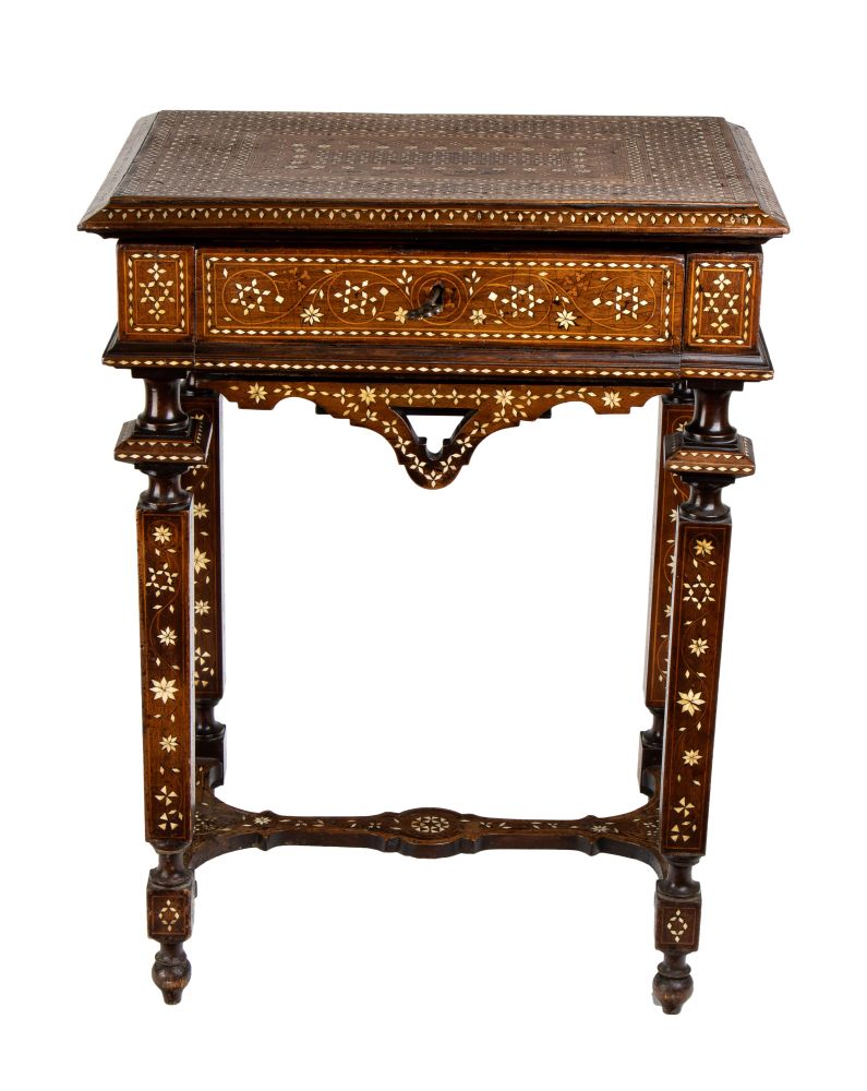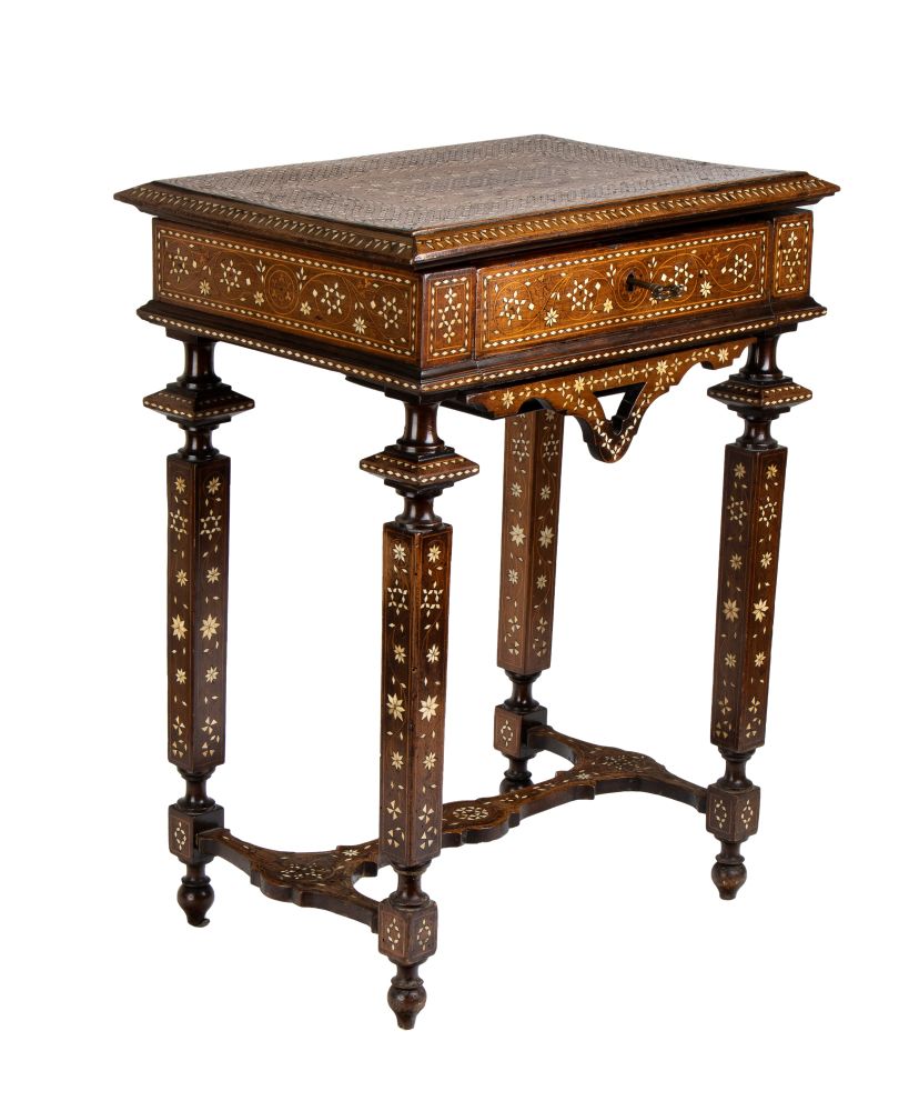 Tavolo siriano porta lavoro intarsiato in osso Metà XIX secolo Altezza x larghezza x profondità: 82 x 122 x 74 cm.