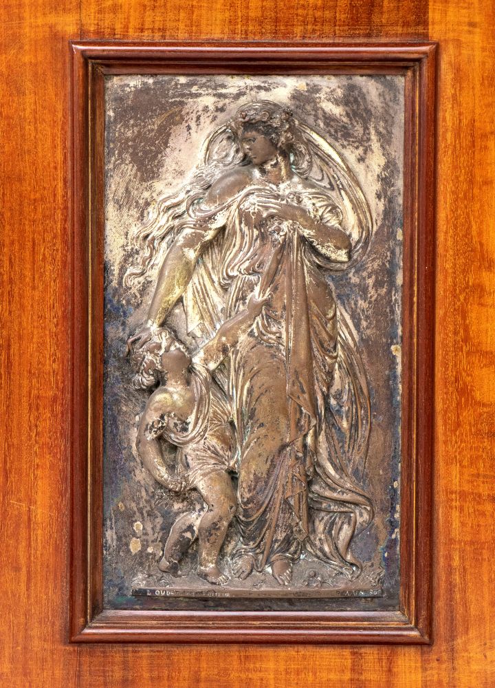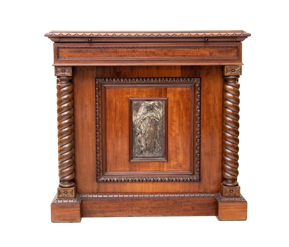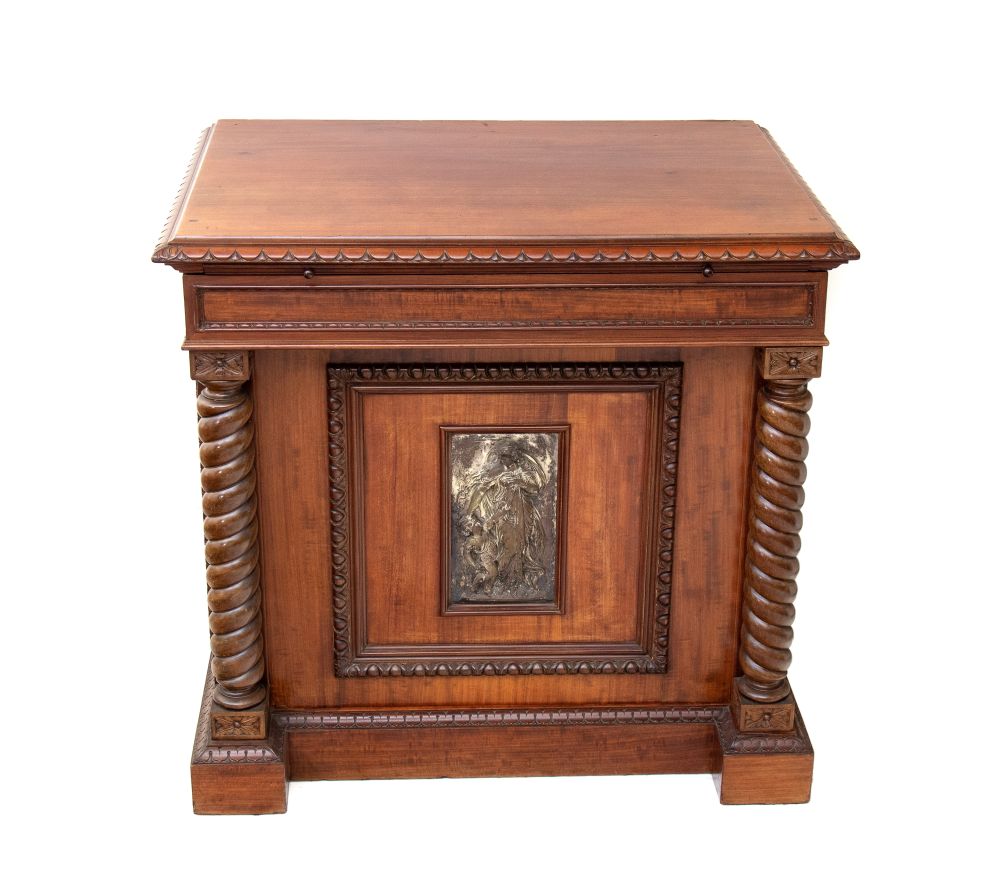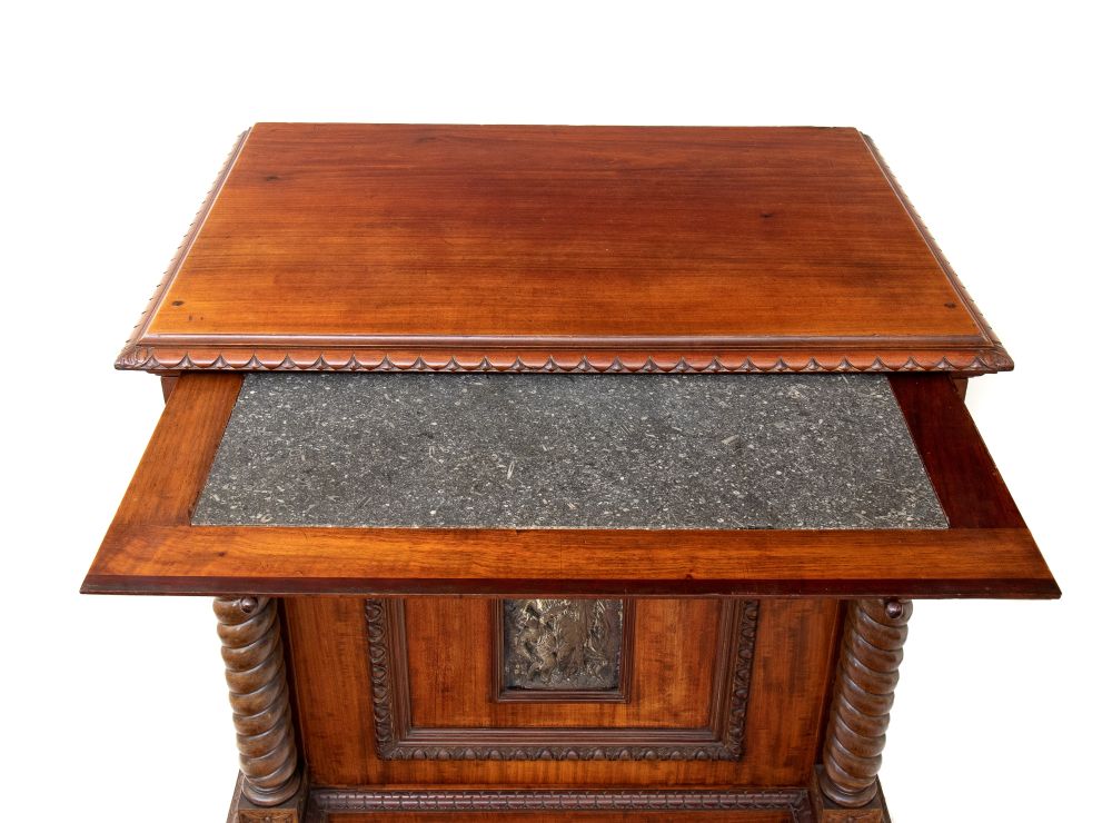 con placca in bronzo argentato sullo sportello, due colonne a torciglione che sorreggono il piano con tiretto estraibile corredato da piano in marmo. Stampigliato sul bordo del cassetto superiore "JULIUS.YACOBI 52 REGENT.ST LONDON"