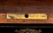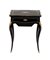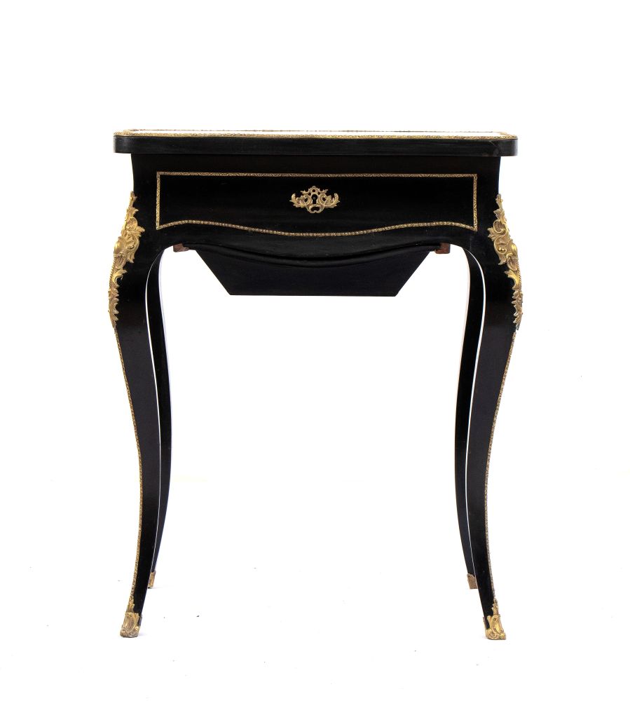 di forma rettangolare centinata, in legno ebanizzato con applicazioni in bronzo dorato, piano intarsiato in ottone a motivi floreali.