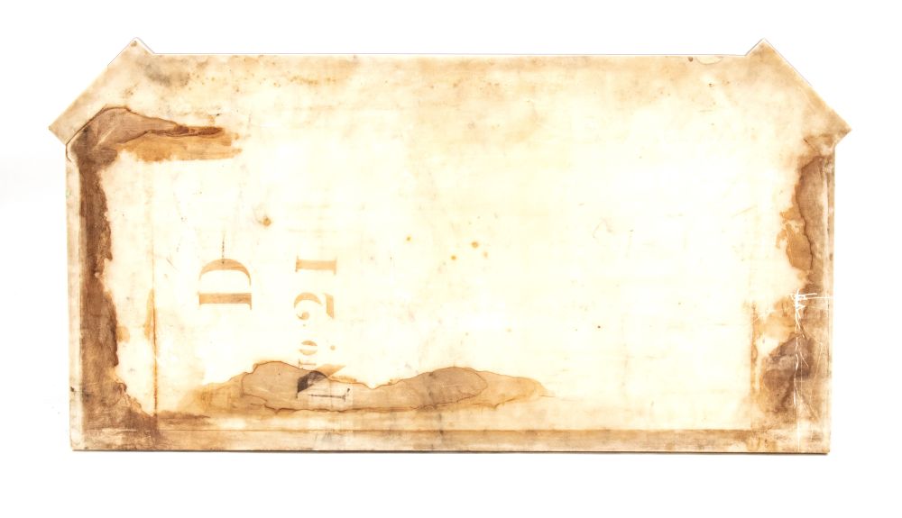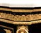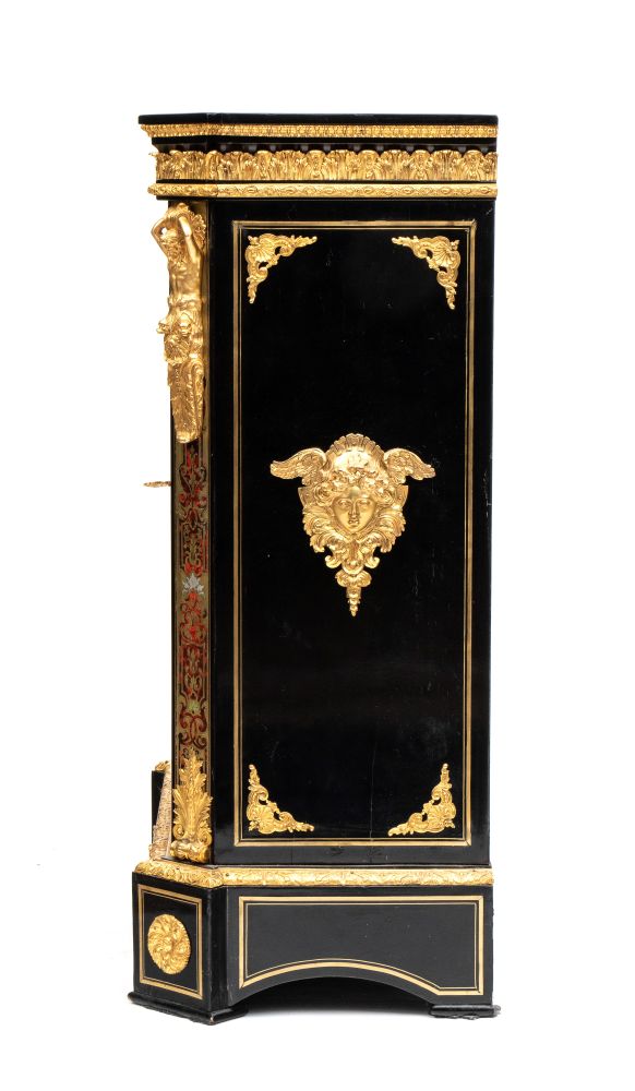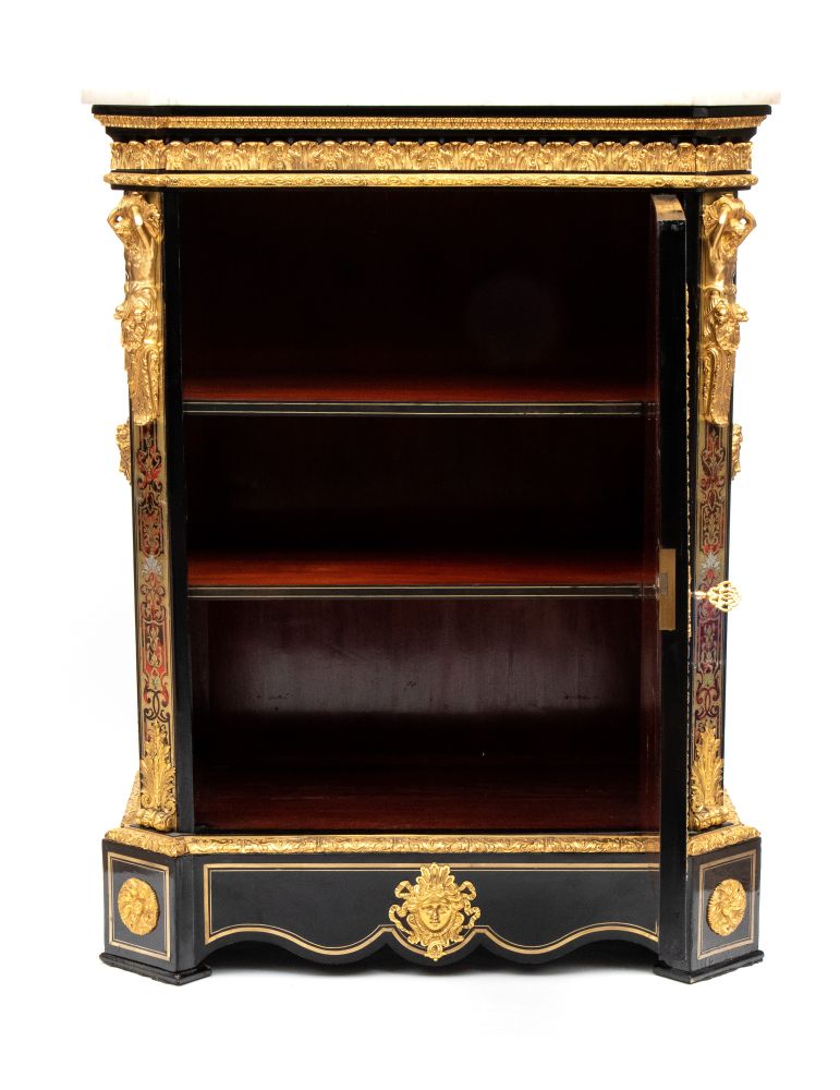 firmato Hippolyte-Edmé Pretot, all'interno dei bronzi con il monogramma H.P., che fu il più grande creatore di mobili in tartaruga del periodo tra il Luigi Filippo e il Napoleone III. Realizzata in legno ebanizzato con ricco decoro in stile Boulle, con applicazioni in ottone e tartaruga, intarsi a motivi vegetali e arabeschi, ornamenti in bronzo dorato finemente cesellati. Il pannello centrale mostra due donne alate contrapposte con ali accolate, due uccelli che si abbeverano, sui fianchi bronzi raffiguranti il Dio Apollo. Piano superiore in marmo bianco sagomato.