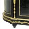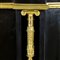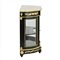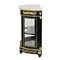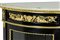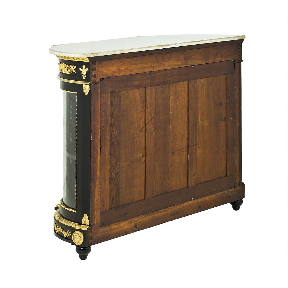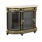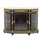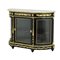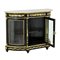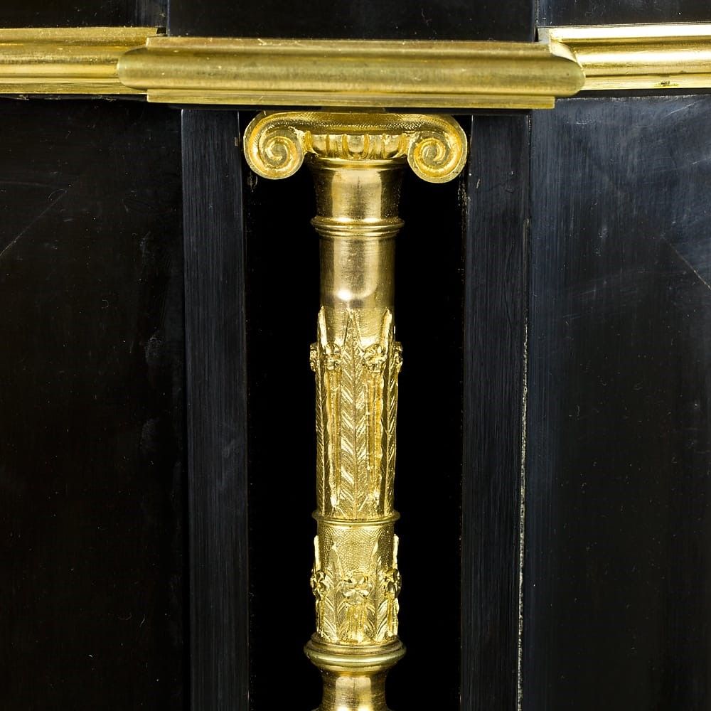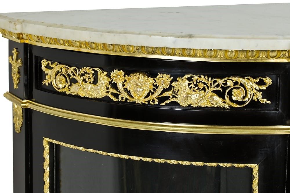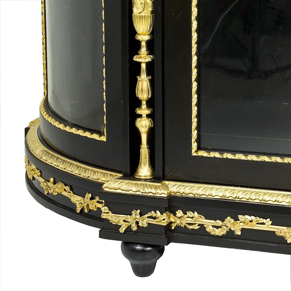 in legno ebanizzato su struttura di rovere, applicazioni in bronzo dorato finemente cesellate, piano in marmo bianco. Di forma mossa con sportello centrale a vetri e due sportelli laterali anch'essi in vetro. Stampigliatura a fuoco sotto il piano in marmo.
