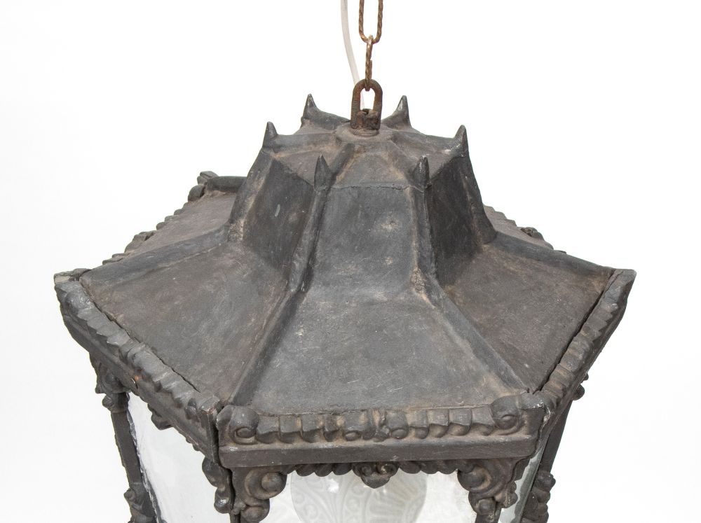 da esterno o interno in ghisa brunita, decorato con motivi floreali e volute in rilievo. Struttura ottagonale, catena di sospensione originale.