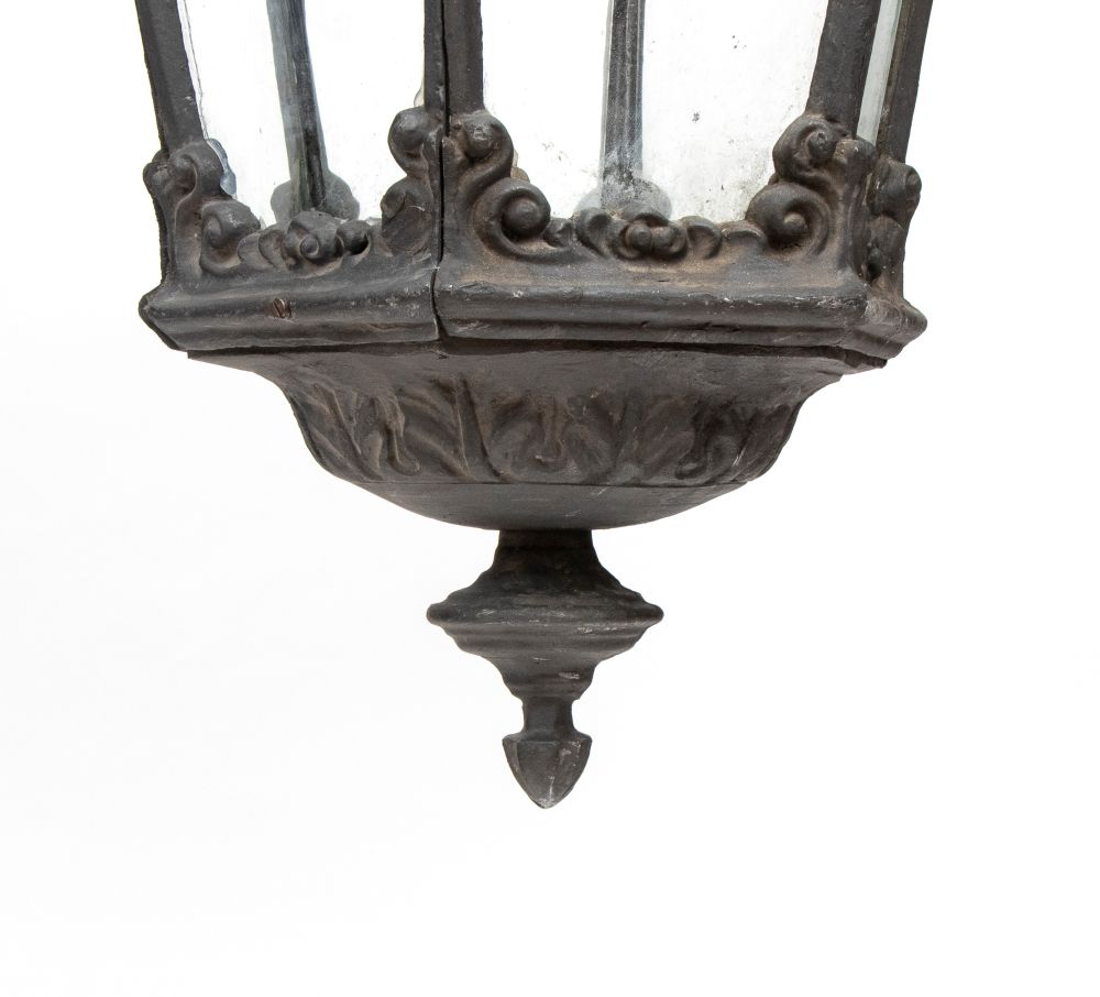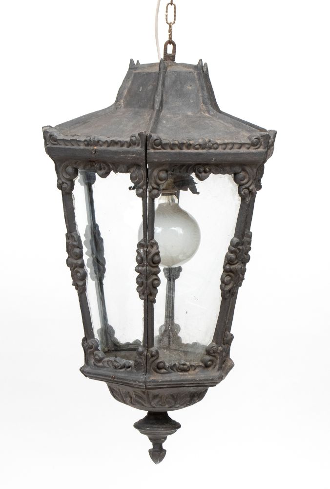 Lampione sospeso in ghisa Italia, XX secolo Altezza x larghezza x profondità: 88 x 45 x 50 cm.