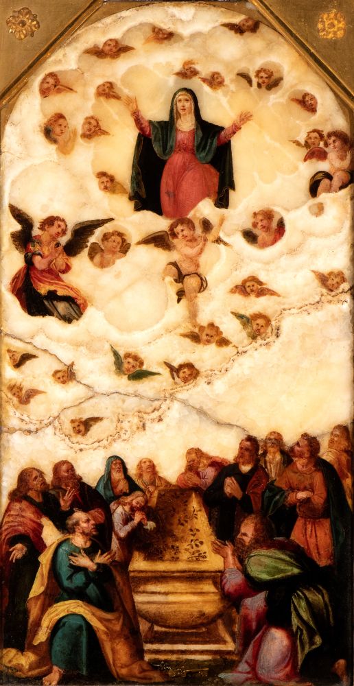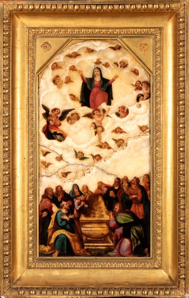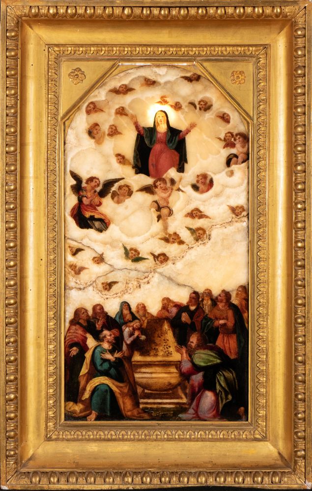 Assunzione della Madonna, dipinto su alabastro Italia, XVII secolo Altezza x larghezza x profondità: 85 x 53 x 9 cm.; alabastro: 63 x 33 cm.