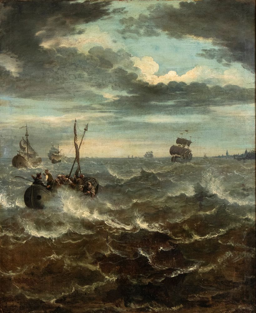 Velieri in tempesta Olanda, XVII secolo Olio su tela Altezza x larghezza: 110 x 90 cm. Altezza x larghezza con cornice: 130 x 107 cm.