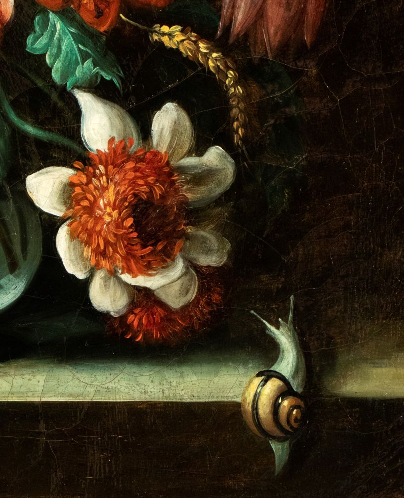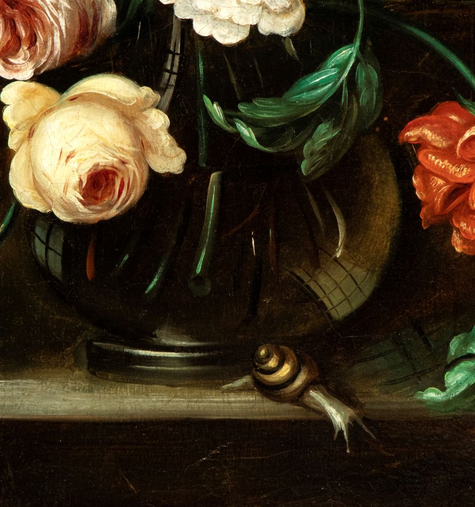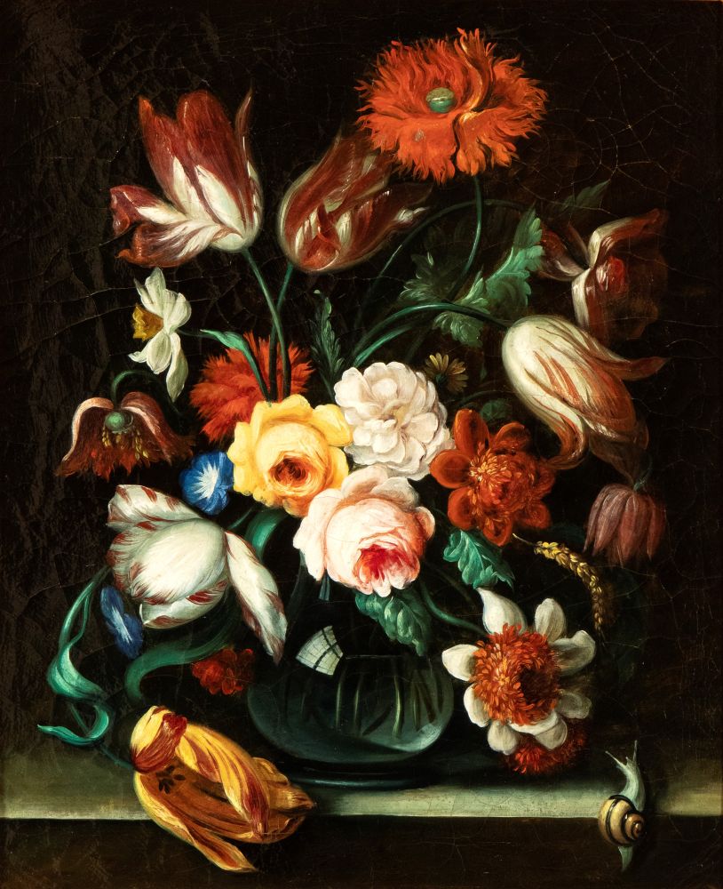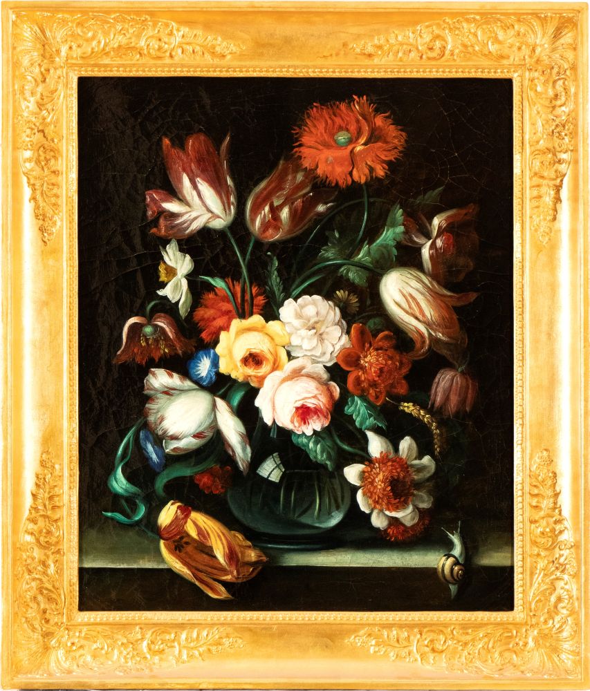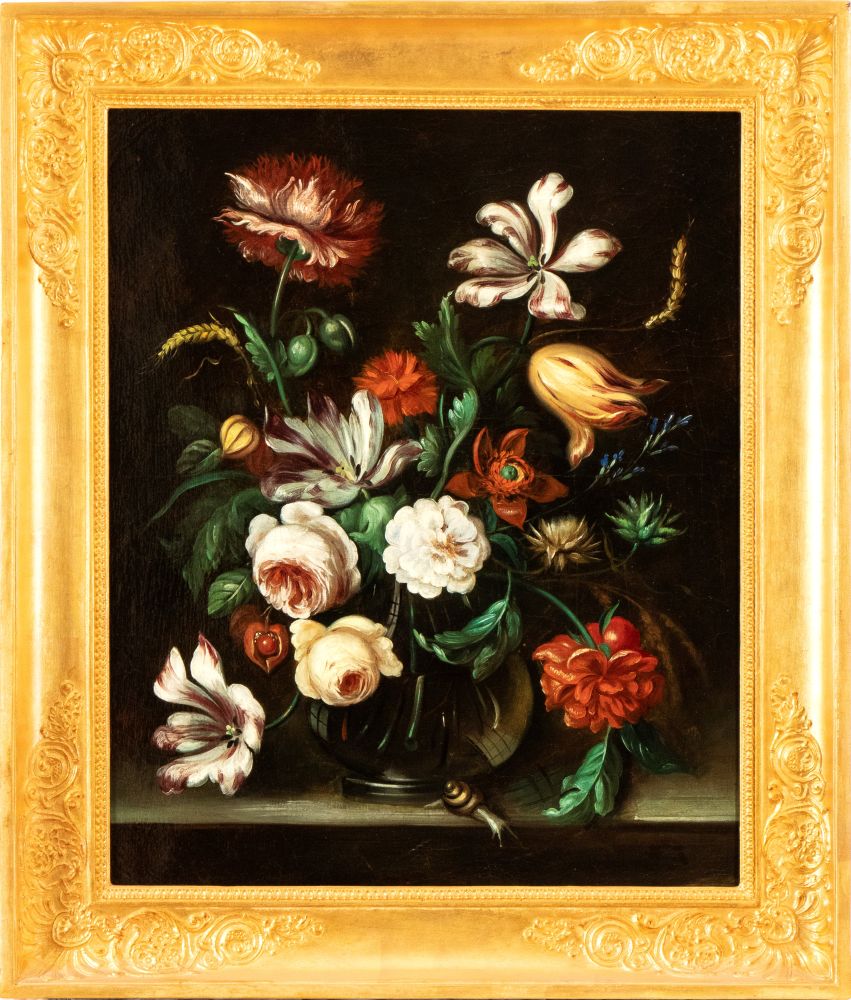 ANONIMO DELLA META’ DEL XIX SECOLO Coppia di nature morte con fiori XIX secolo Olio su tela Altezza x larghezza tela: 50 x 62 cm.; con cornice: 63,5 x 74,5 cm.