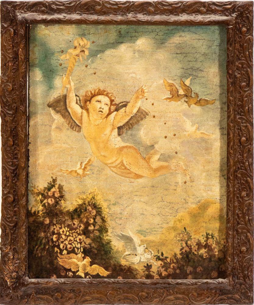 Anonimo della fine del XVII secolo Dipinto con angelo XVII-XVIII secolo Olio su tela Altezza x larghezza tela: 31,5 x 40 cm; con cornice: 39 x 47 cm.