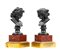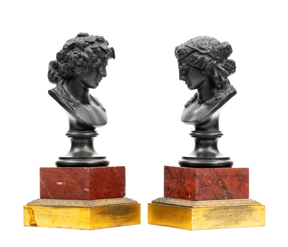 in bronzo patinato raffiguranti una figura maschile con corona di pampini e una figura femminile con corona di spighe ( probabilmente Dioniso/Bacco e Cerere), entrambi su base di marmo rosso di Francia con zoccolo in bronzo dorato finemente cesellato.