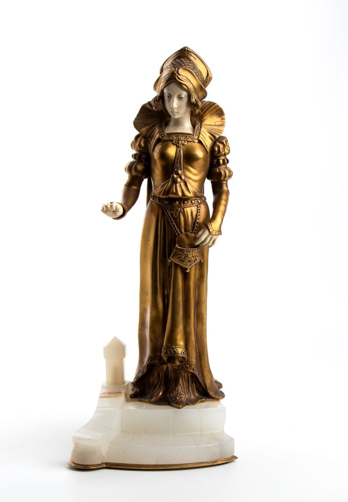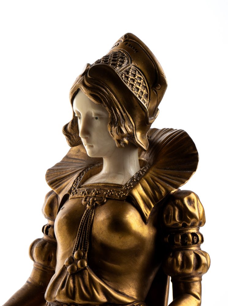 in bronzo dorato raffigurante una figura femminile vestita con abiti rinascimentali, con mani e viso in avorio di elefante (Elephas maximus Linnaeus, 1758 or Loxodonta africana Blumenbach, 1797). Poggiante su basamento in marmo gradinato.