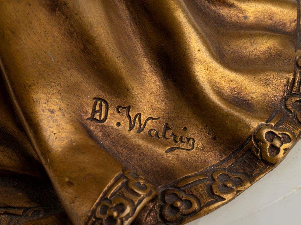 ETIENNE WATRIN (1890 - 1915) Fanciulla elisabettiana in piedi finemente vestita, bronzo e avorio 1900 circa Altezza x larghezza x profondità: 35,5 x 14 x 14 cm. Peso: 3700 gr.