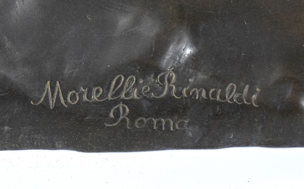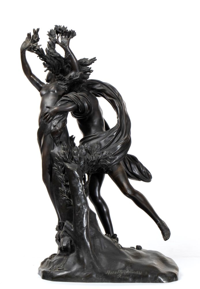 simboleggiante il momento culminante del mito in cui Dafne, per sfuggire ad Apollo si trasforma in alloro. Firmata sulla base "Morelli e Rinaldi Roma".