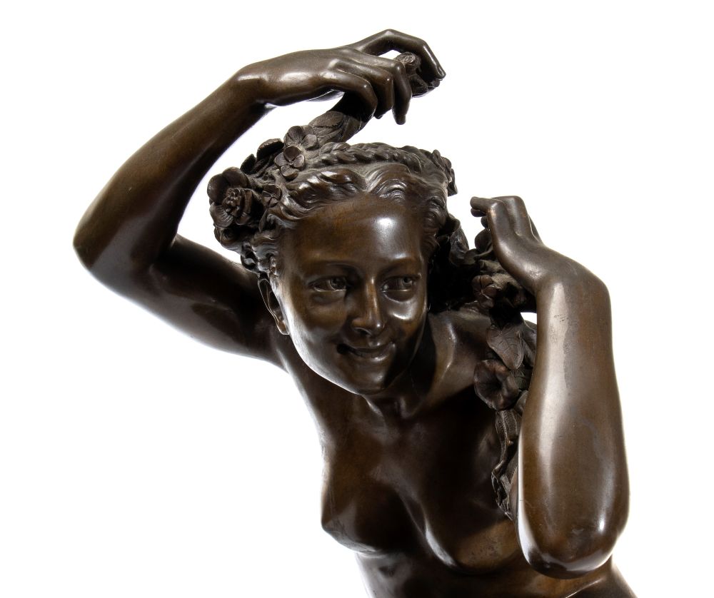Flora china che intreccia i capelli con fiori, figura classica dell'Ottocento, firmata sulla base "Carpeaux".