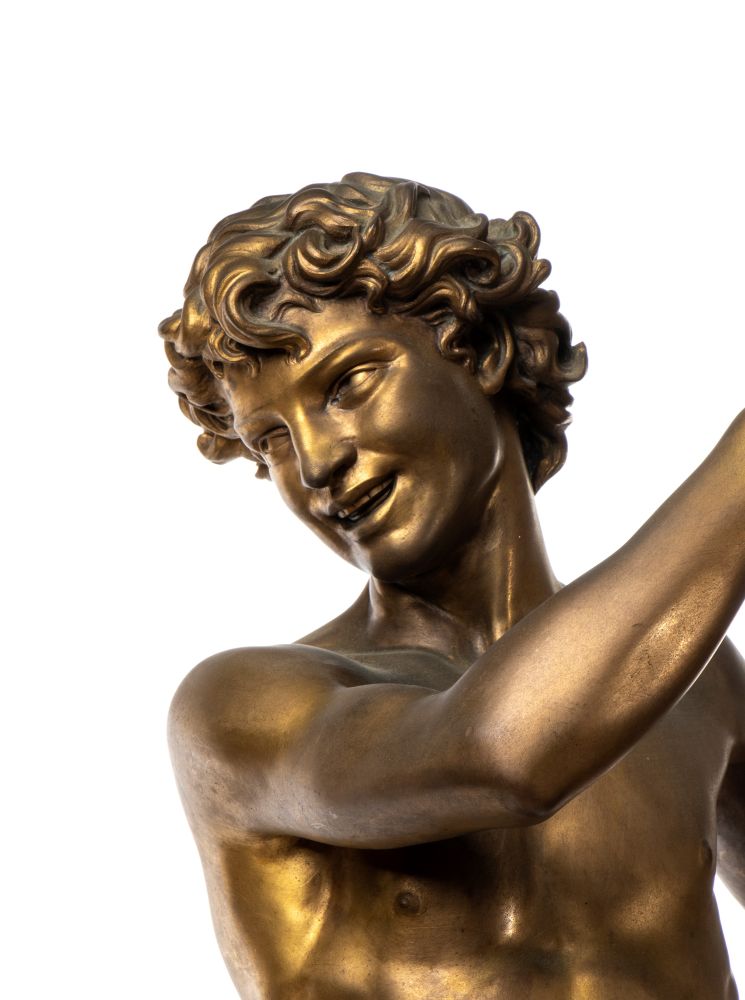 Straordinaria scultura in bronzo realizzata dall’artista francese Justin Chrysostome Sanson, figura di spicco nella scultura ottocentesca in bronzo e marmo. Nato a Nemours l’8 agosto 1833, Sanson ottenne grande notorietà con la presentazione di Le Danseur de Saltarelle nel 1861, opera che gli valse il Primo Gran Premio di Roma.