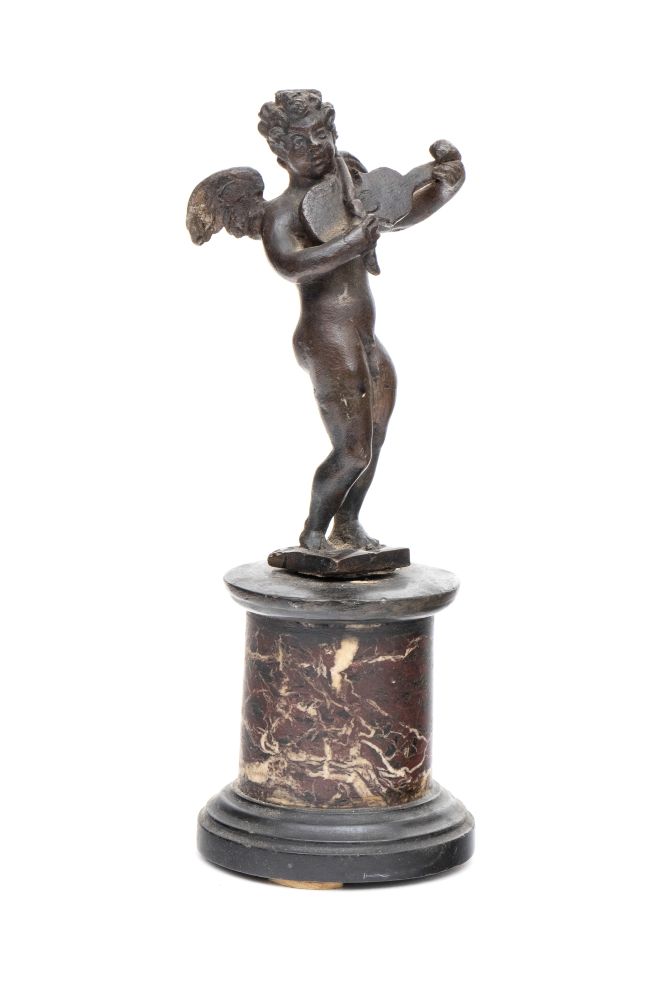 Scultura in bronzo raffigurante putto musicante Italia, XIX secolo Altezza x diametro: 22 x 8 cm.