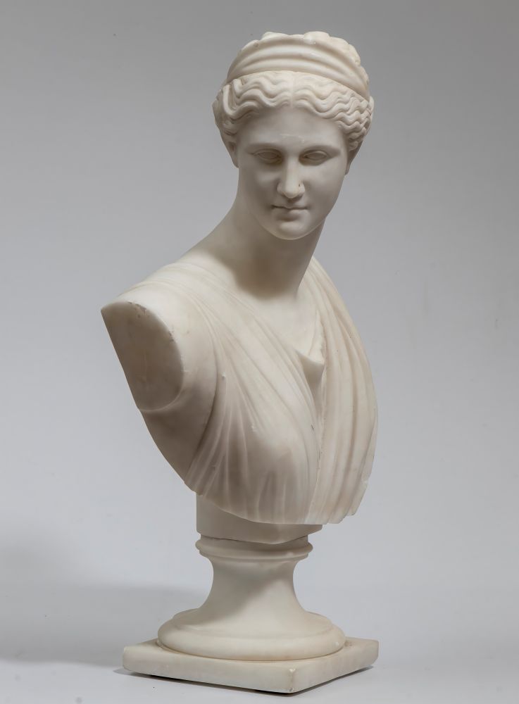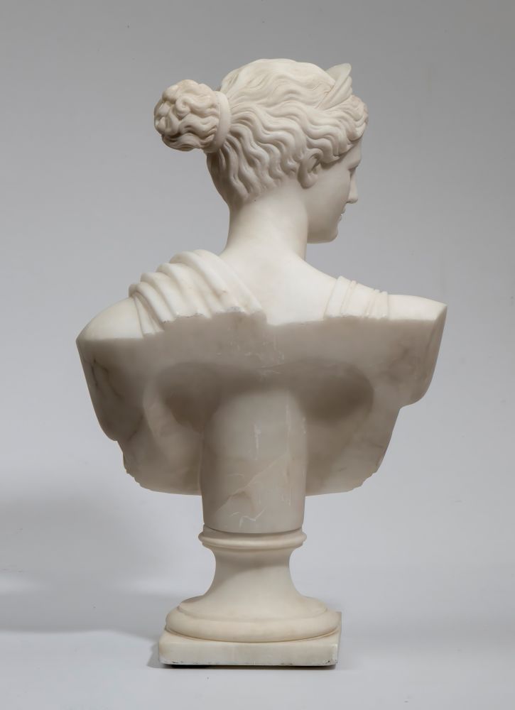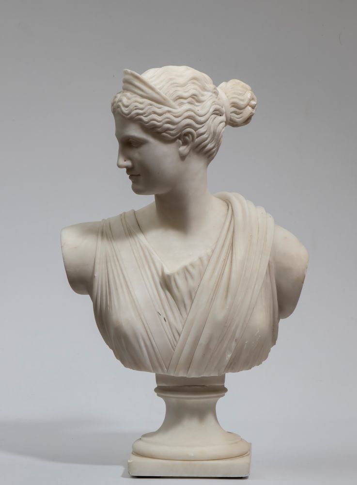 Busto in marmo raffigurante Diana Italia, inizio XX secolo Altezza x larghezza x profondità: 42 x 27 x 17 cm.