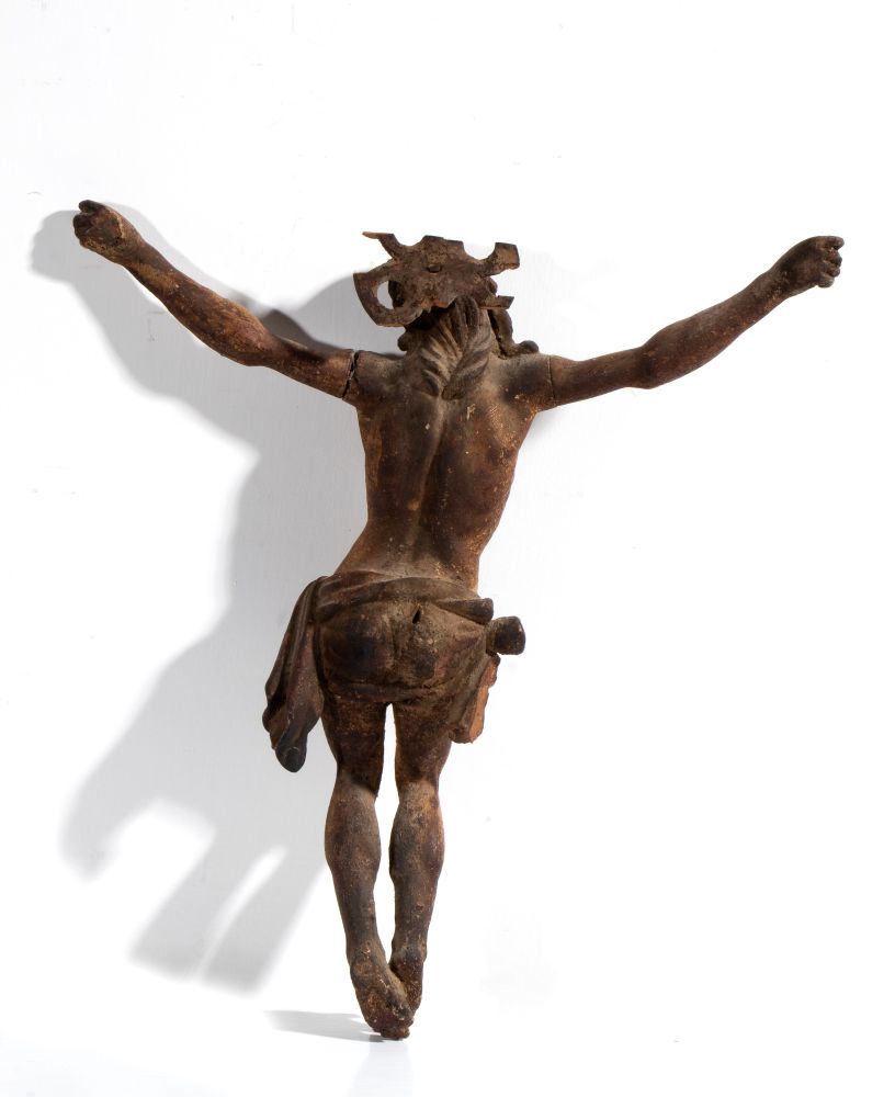 Cristo crocifisso in legno scolpito e dipinto Italia centrale, XVII secolo Altezza x larghezza x profondità: 41,5 x 36,5 x 7,5 cm.