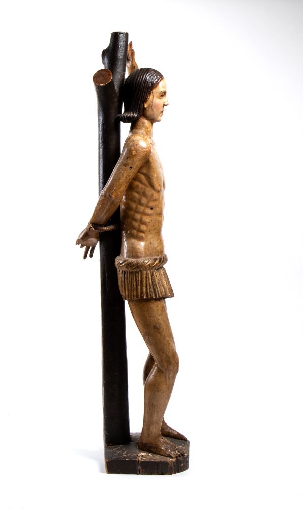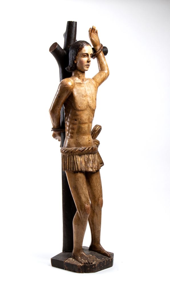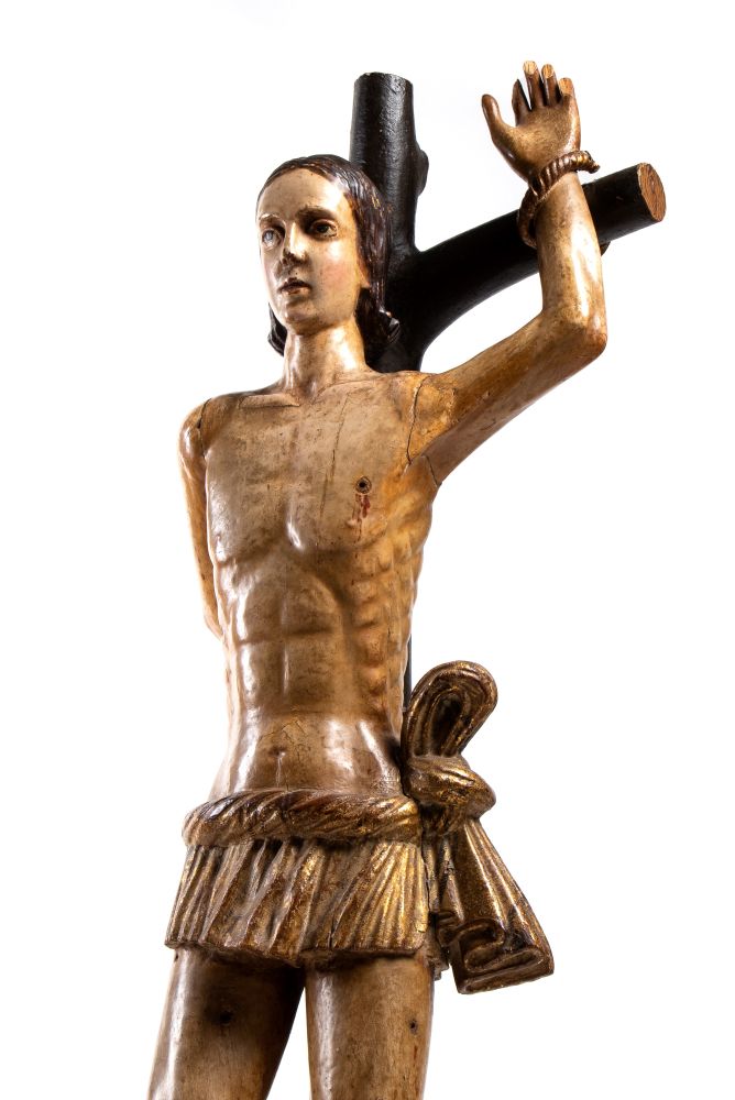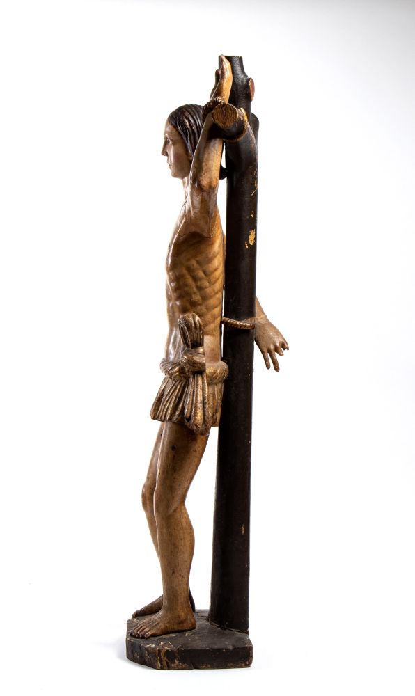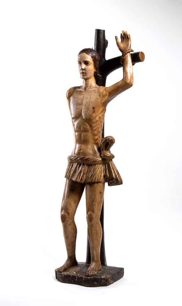Scultura italiana raffigurante San Sebastiano Area Alpina, XVII secolo Altezza x larghezza x profondità: 140 x 50 x 35 cm.