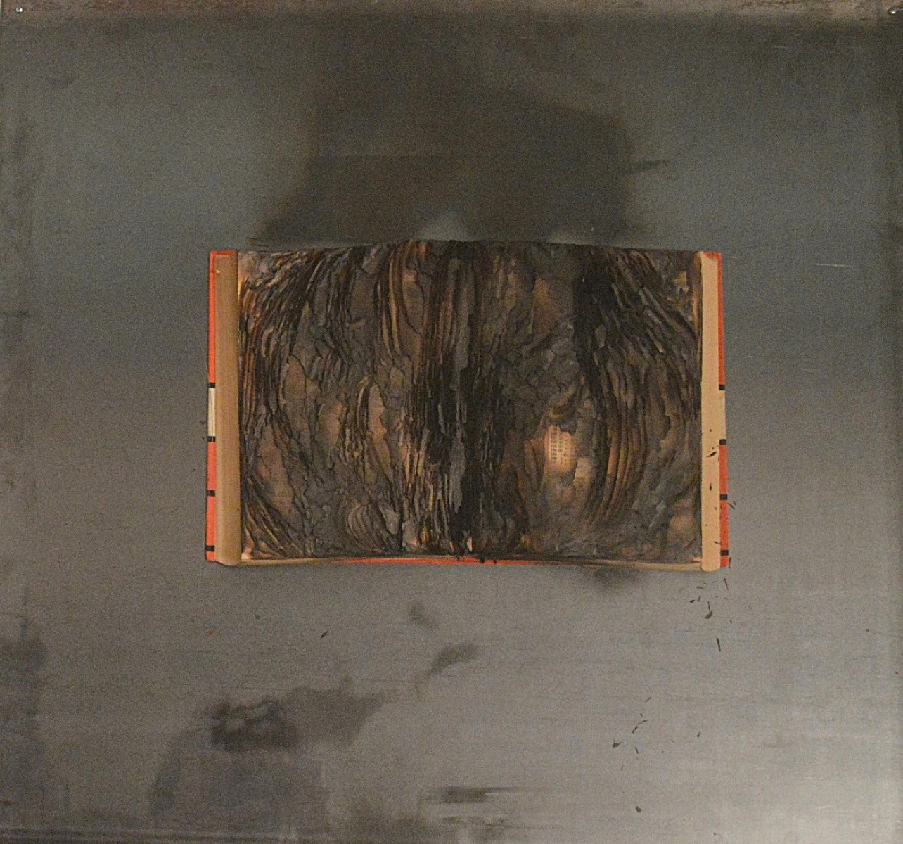 AUBERTIN BERNARD Francia 1934 - Germania 2015 "Livre brulè" Libro e combustioni su acciaio cm 74x70 in teca di plexiglass, del 2010. Al verso firma, data ed etichetta di altra galleria. Certificato di autenticità e garanzia a cura di Meetingart.