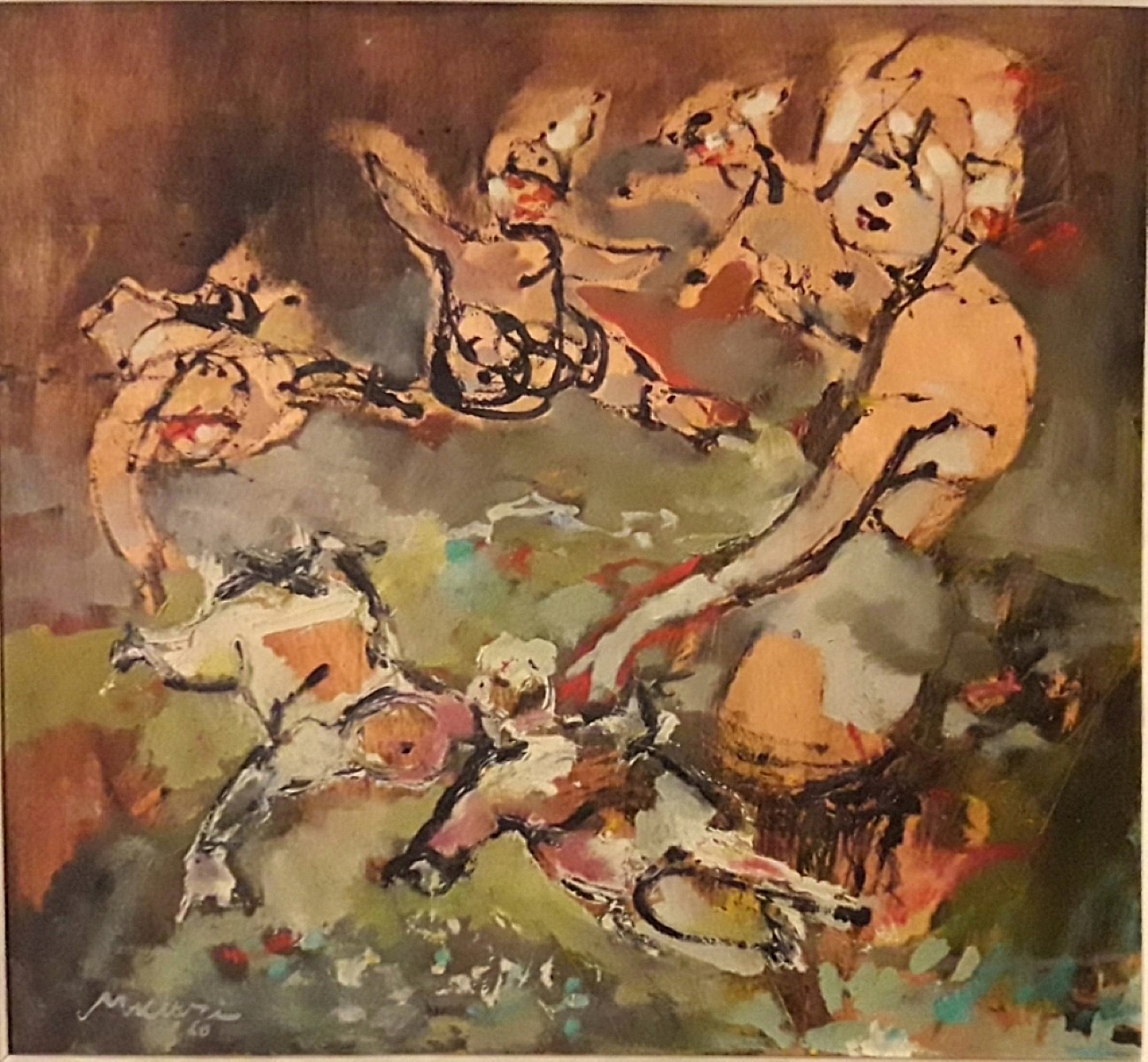 MACCARI MINO Siena 1898 - Roma 1989 "Girotondo" Olio su tavola cm 60x55 del 1960. Opera firmata e datata sul fronte in basso a sinistra. Sul retro presenta un bozzetto per dipinto. Registrata presso l'Archivio Mino Maccari, a cura dell'Artista, come da dichiarazione su foto. Provenienza e dichiarazione di autenticità a cura della MeetingArt.