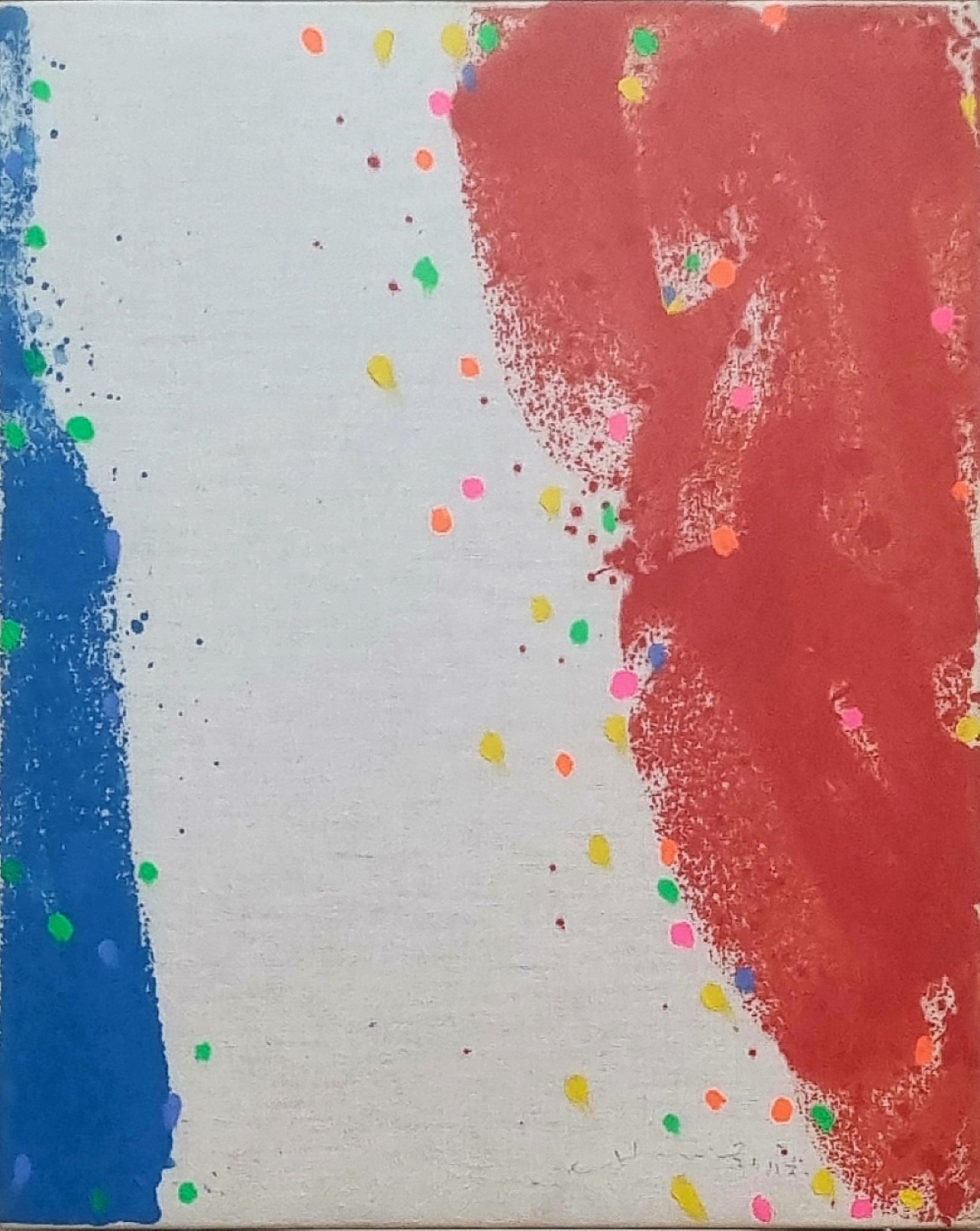 HSIAO CHIN Shanghai 1935 "Vento rosso - 2" Acrilico e olio su tela cm 33x41. Firmato sul fronte in basso a destra. Al verso titolo, tecnica e timbro a secco. Autentica su foto a cura del Maestro con timbro di provenienza Galleria Spriano Omegna.