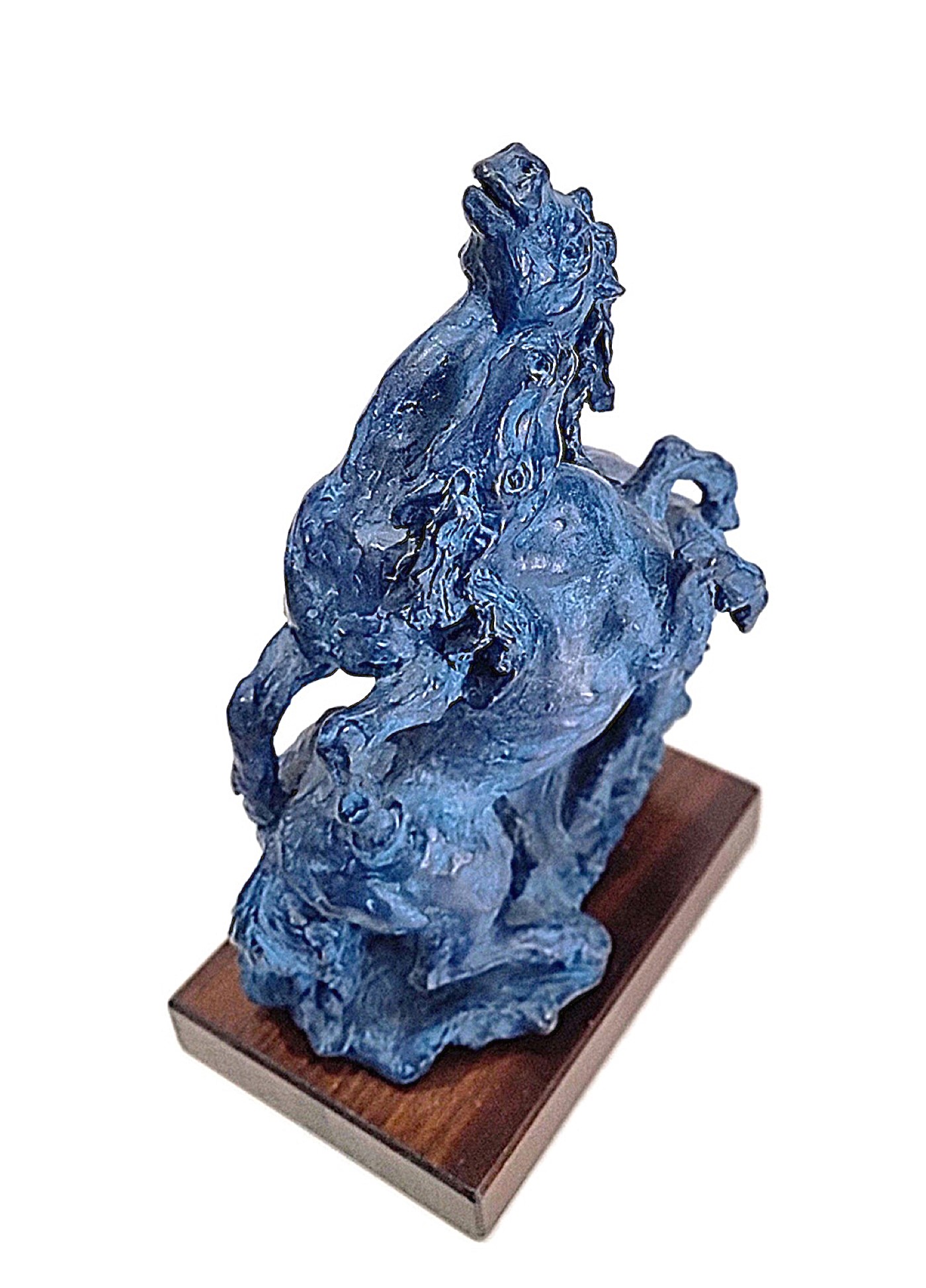 SASSU ALIGI Milano 1912 - Spagna 2000 "Due cavalli rampanti" Scultura in bronzo in fusione a cera persa con patina blu cm 36x28x17. Esemplare 1/9, pezzo unico. Firma per incisione in basso a sinistra. Autentica su foto con numero a cura dell'Archivio Aligi Sassu.