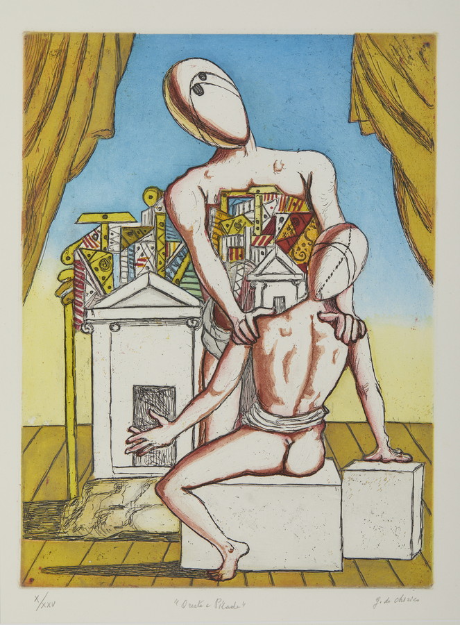 DE CHIRICO GIORGIO (1888 - 1978) ORESTE E PILADE (II VERSIONE). 1970. Acquaforte e acquatinta. Cm 50,50 x 70,00. firma, titolo e tiratura a matita, es. X/XXV