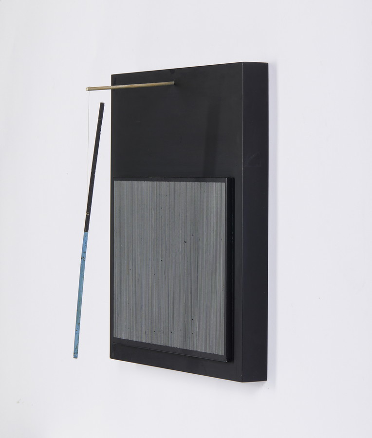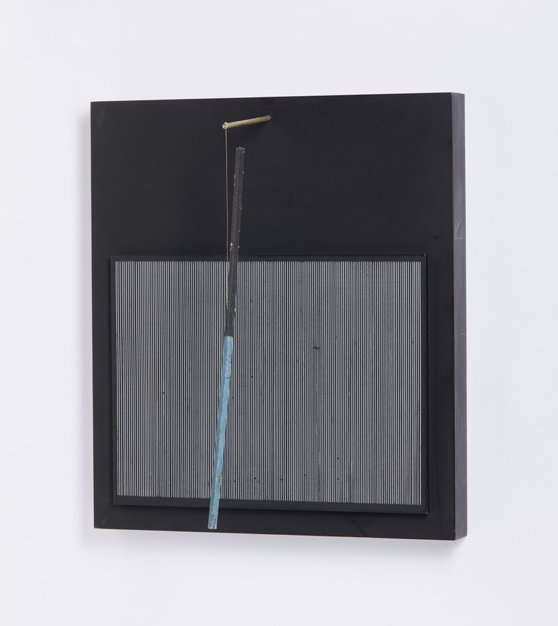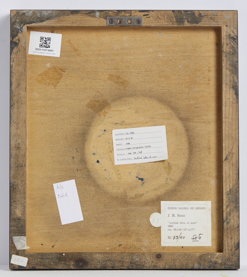 SOTO JESUS RAFAEL (1923 - 2005) INCLINE' BLEU ET NOIR. 1966. legno verniciato con asta di metallo verniciato e filo di nylon. Cm 38,00 x 43,00. sul retro: etichetta Edizioni Galleria Del Deposito, Genova, riportante la firma dell'artista e la tiratura, es. 73/100.
