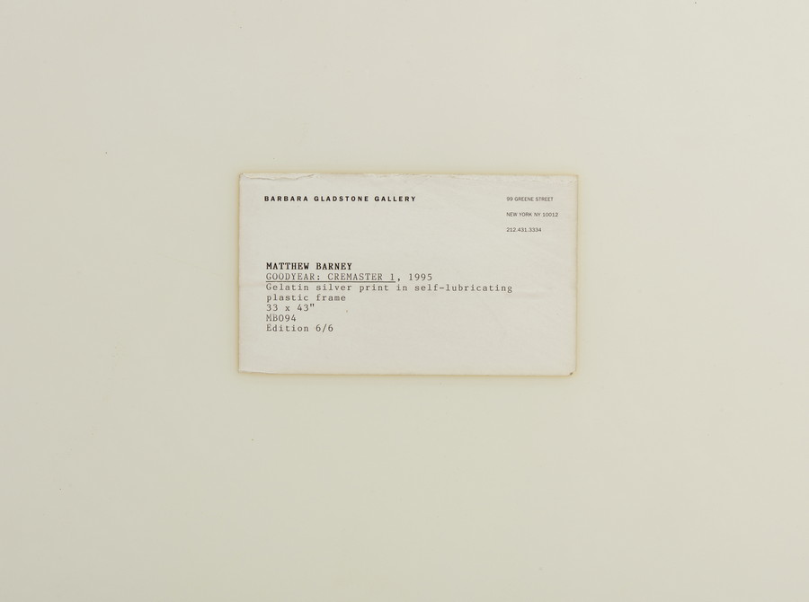 BARNEY MATTHEW (n. 1967) CREMASTER I: GOODYEAR. 1995. Stampa alla gelatina d'argento in cornice di plastica autolubrificante. Cm 108,00 x 82,00. sul retro: firma a pennarello ed etichetta Barbara Gladstone Gallery, New York, es. 6/6