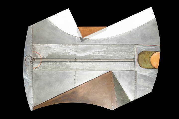 109x144x4,5, pannello in legno rivestito di lamiera e particolari geometrici in rame e legno