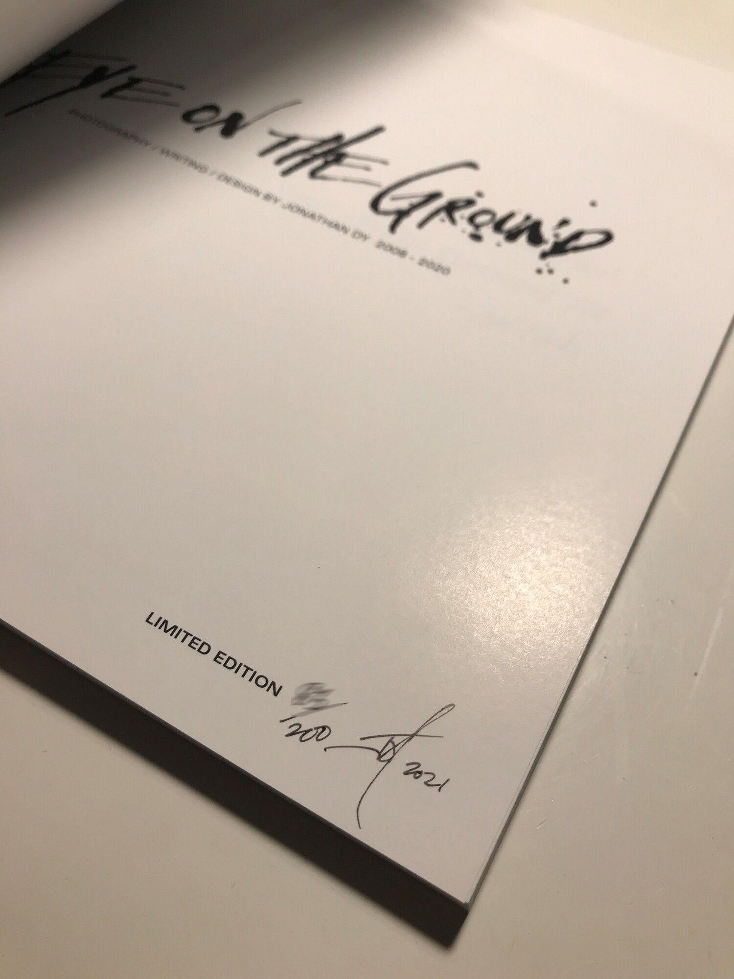 Libro Limited Edition autografato "Eye on the ground" Ed.90/200; 130 pagine; provenienza: direttamente dall’artista e da Image in Progress; condizioni: nuove.