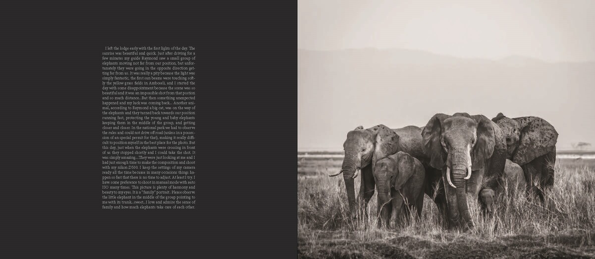 Libro fotografico tratto dai suoi tre anni di lavoro sul campo relativo alla fauna del Kenya, con focus sugli elefanti di Amboseli. Alta qualità di stampa, per sensibilizzare e supportare fauna e comunità Maasai.