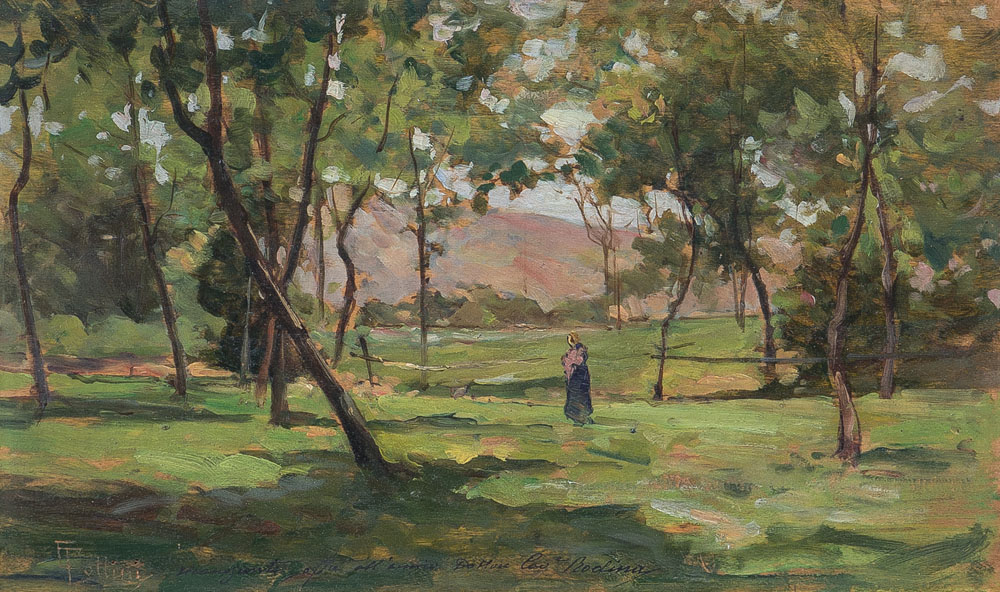 olio su tavola cm. 17,2x28,9; firma in basso a sinistra, dedica ad personam in basso al centro, presenta un bozzetto per paesaggio ad olio al retro, timbro e firma per autenticità della Galleria F.lli Fogliato (TO) su foto.