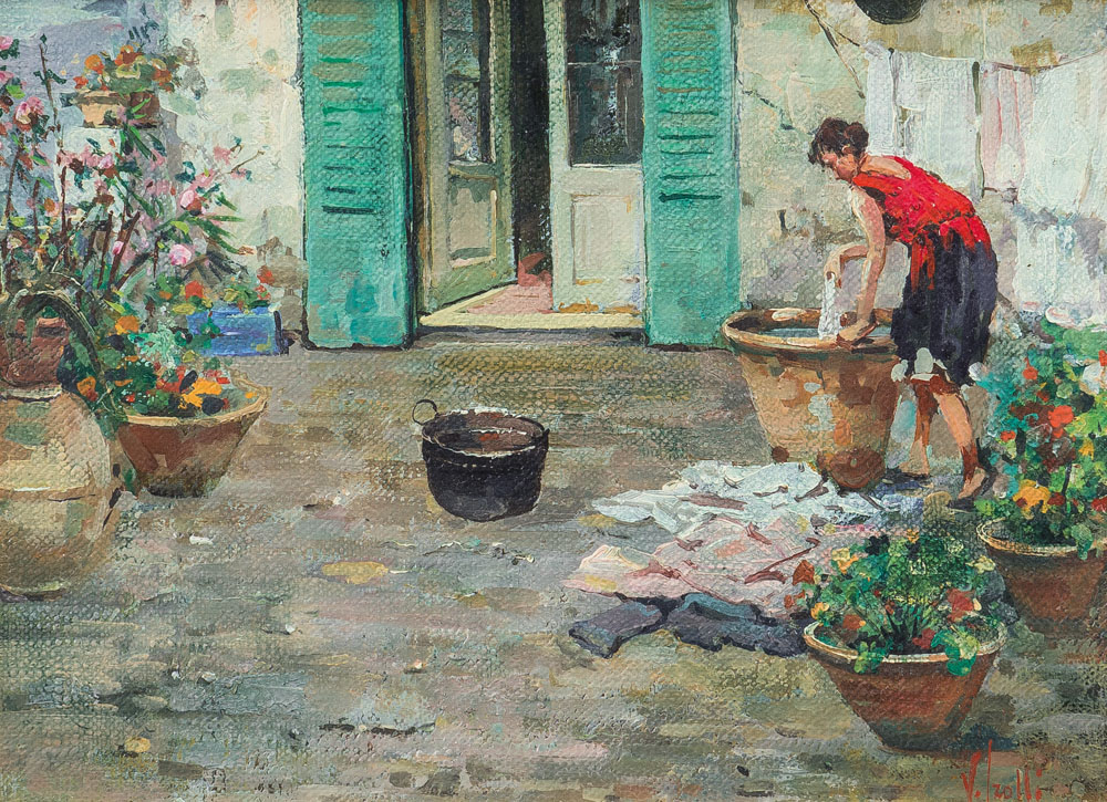 Lotto 450 | IROLLI VINCENZO Napoli 30/09/1860 - 27/11/1942In terrazza, ragazza che stende...