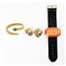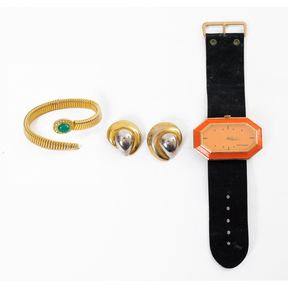 Orologio a quarzo con quadrante ottagonale in smalto arancione, cinturino a fascia nero, marchio di produzione. Bracciale tubo gas con montatura in metallo dorato, cabochon in pietra sintetica verde, diamanti sintetici taglio brillante.